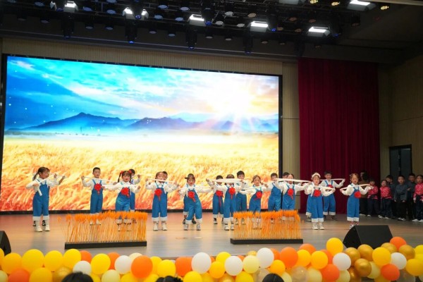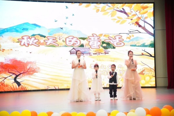 活动当天,报告厅内洋溢着浓浓的秋日气息。舞台上,五彩斑斓的气球、金黄的稻穗、火红的枫叶装点出一幅生动的秋日画卷。孩子们化身童话中的小精灵,在秋的舞台上尽情绽放童真与才华。