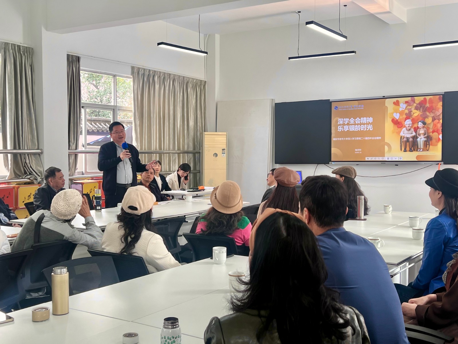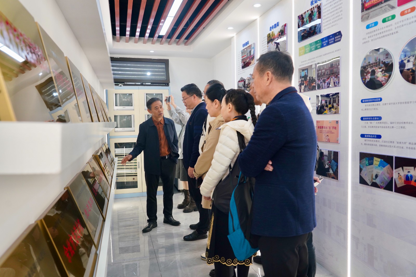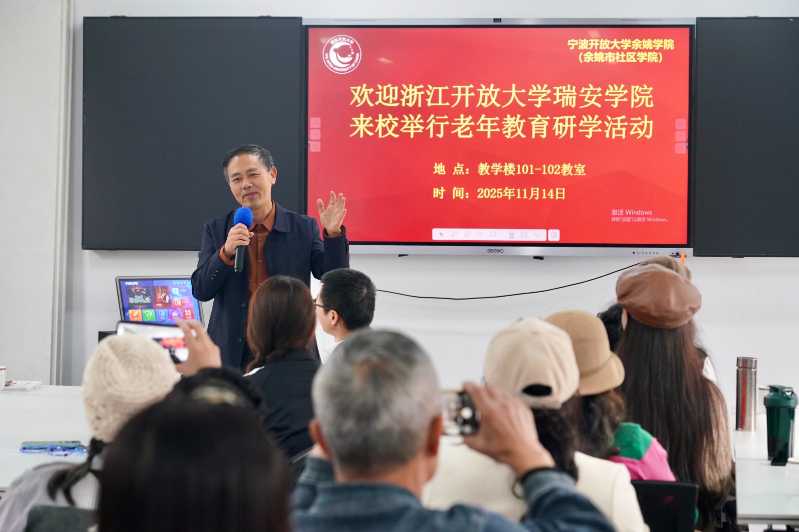 11月14日,浙江瑞安城市学院研学团在副院长池万村的带领下,专程赴宁波开放大学余姚学院考察交流,聚焦老年教育体系建设、精品课程打造及社团发展等核心议题。余姚学院副书记副院长王振南、副校长徐文吉携社教处、培训处教师热情接待,双方以实地观摩、座谈交流等形式,共探老年教育高质量发展路径。