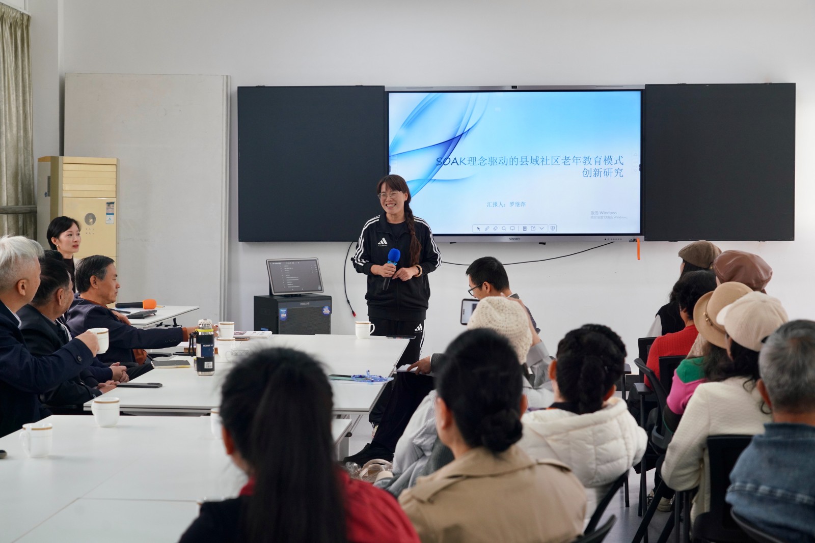 交流座谈会由社教处主任陆燕青主持。会上,王振南副书记首先回顾了两校过往的友好交流历程,对研学团的到来表示热烈欢迎。随后,研学团集体观看了余姚学院宣传片及浙江省获奖作品《东南最名邑,四明诗路长》,直观了解学院办学特色与文化成果。罗继萍老师以《SOAK理念驱动的县域社区老年教育模式创新实践》为题作课题汇报,从模式构建、实践成果、未来规划三个维度,详细介绍了余姚学院在老年教育领域的创新探索与显著成效。王振南副书记还结合瑞安与余姚同为GDP千亿县级城市的共性,介绍了余姚农工商产业特色,分享了学院给合功能定位着重聚焦队伍建设和创新特色赋能老年教育的经验做法。