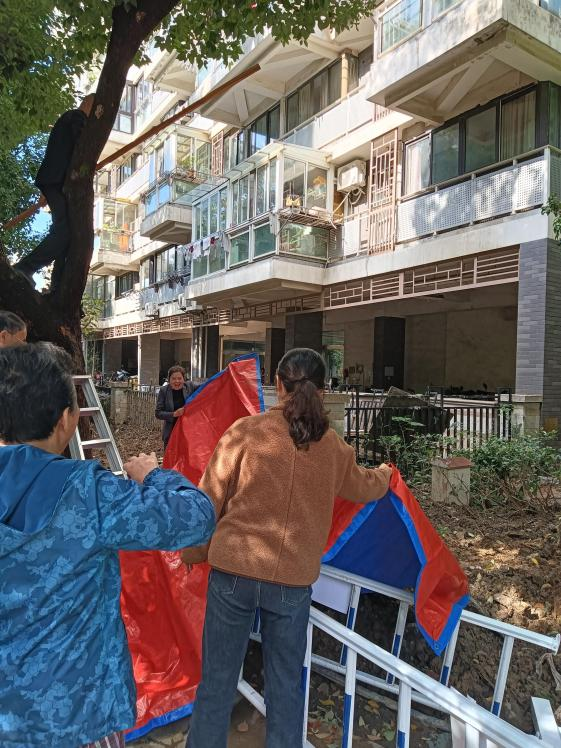 11月13日天气转晴,网格员始终将居民诉求放在心上,再次前往郑阿姨家楼下开展精细化排查。凭借长期积累的区域环境熟悉度,最终在一棵枝繁叶茂的大树高枝处发现目标物品。网格员立即拍摄照片与郑阿姨核对,经确认正是其遗失的蚕丝被。为安全取回物品,网格员迅速联系物业经理协调工作人员携带工具到场,通过网格与物业的联动协作,成功将悬挂于离地约6米高枝上的蚕丝被安全取下。