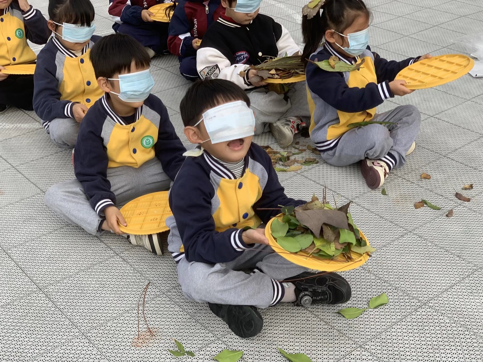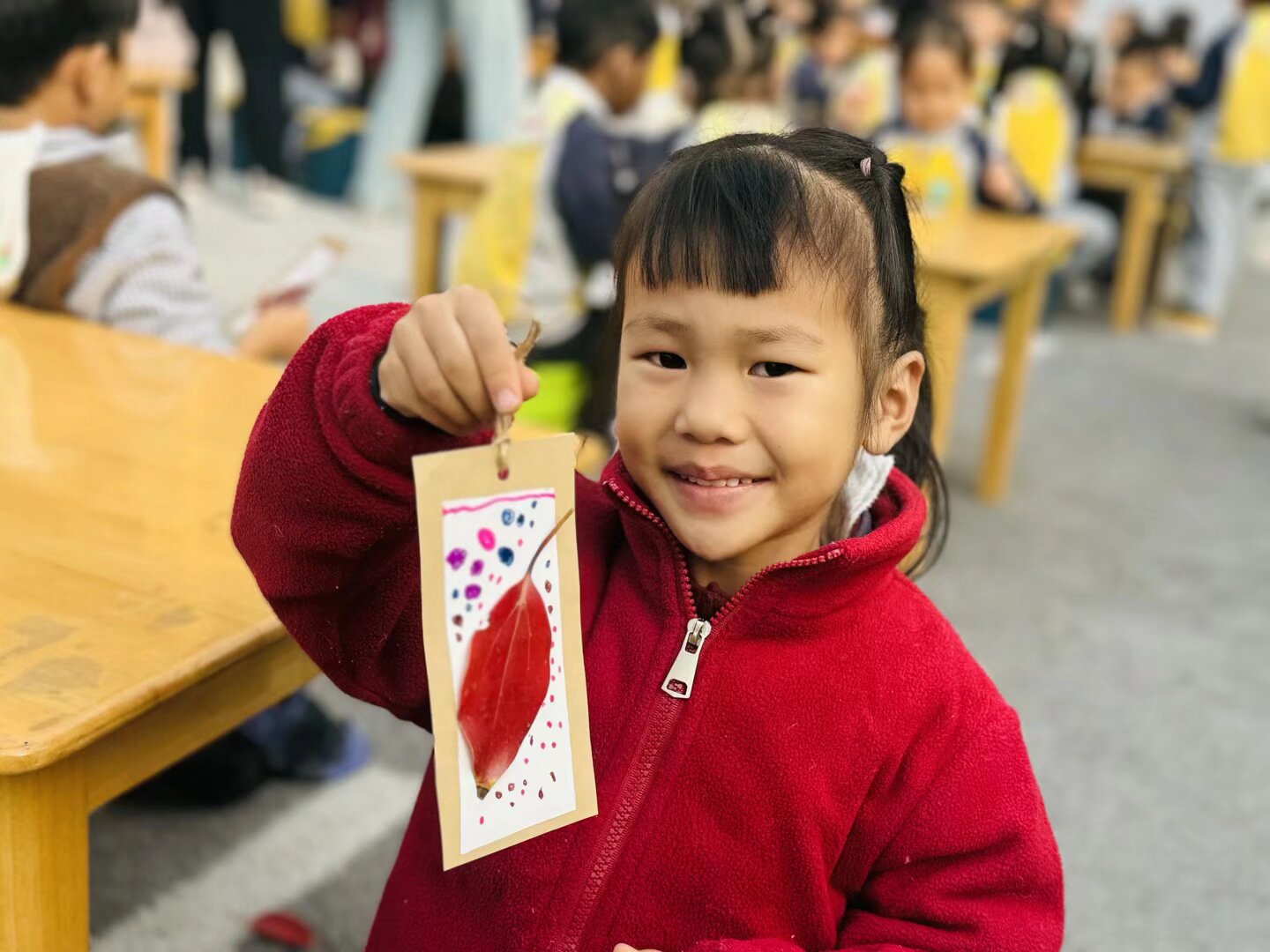 活动伊始,孩子们化身为小小的“自然收藏家”在老师引导下,他们用稚嫩的小手,将精心收集来的形态各异、色彩斑斓的落叶旁图上颜料圆点、爱心加以点缀……一片片普通的树叶,在孩子们充满想象力的创作下,变成了一张张独一无二的精美书签。活动的第二个环节,随着欢快的音乐响起正式拉开帷幕。孩子们脸上洋溢着灿烂的笑容,在舞台上尽情歌唱,一首《秋天多么美》,让孩子们感受到秋天的美好。在游戏环节《落叶传秋》,孩子们蒙着眼睛,往后传递落叶,到最后看剩下多少落叶,感受到落叶游戏带来的快乐。