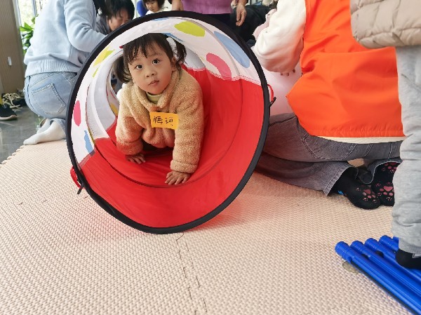 活动伊始,“红黄蓝”的早教老师便以活泼轻快的趣味儿歌唱跳拉开序幕。老师手持可爱玩偶,用夸张灵动的表情、轻快活泼的动作引导宝宝们参与,《小兔子乖乖》《拍手歌》等经典儿歌轮番上演。步履蹒跚的宝宝们兴致勃勃地模仿,或挥着小手打节拍,或在家长搀扶下蹦跳,亲子间的温情互动瞬间点燃现场氛围。结合婴幼儿的发育特点,现场还专门设置了感统训练区,攀爬垫、彩虹平衡木、卡通隧道爬行筒等设施整齐排列。在老师引导与家长鼓励下,孩子们勇敢探索:有的手脚并用地穿梭隧道,有的屏气走过平衡木,每一次尝试、每一点进步都赢得现场阵阵掌声。“用彩色餐具教宝宝辨色,借高低凳子练跳跃,日常场景就能助力感知发展。”老师分享的实用育儿方法让家长们受益匪浅。“宝宝平时怕生,今天格外活跃,还学会了不少技能。”一位家长欣喜地说。