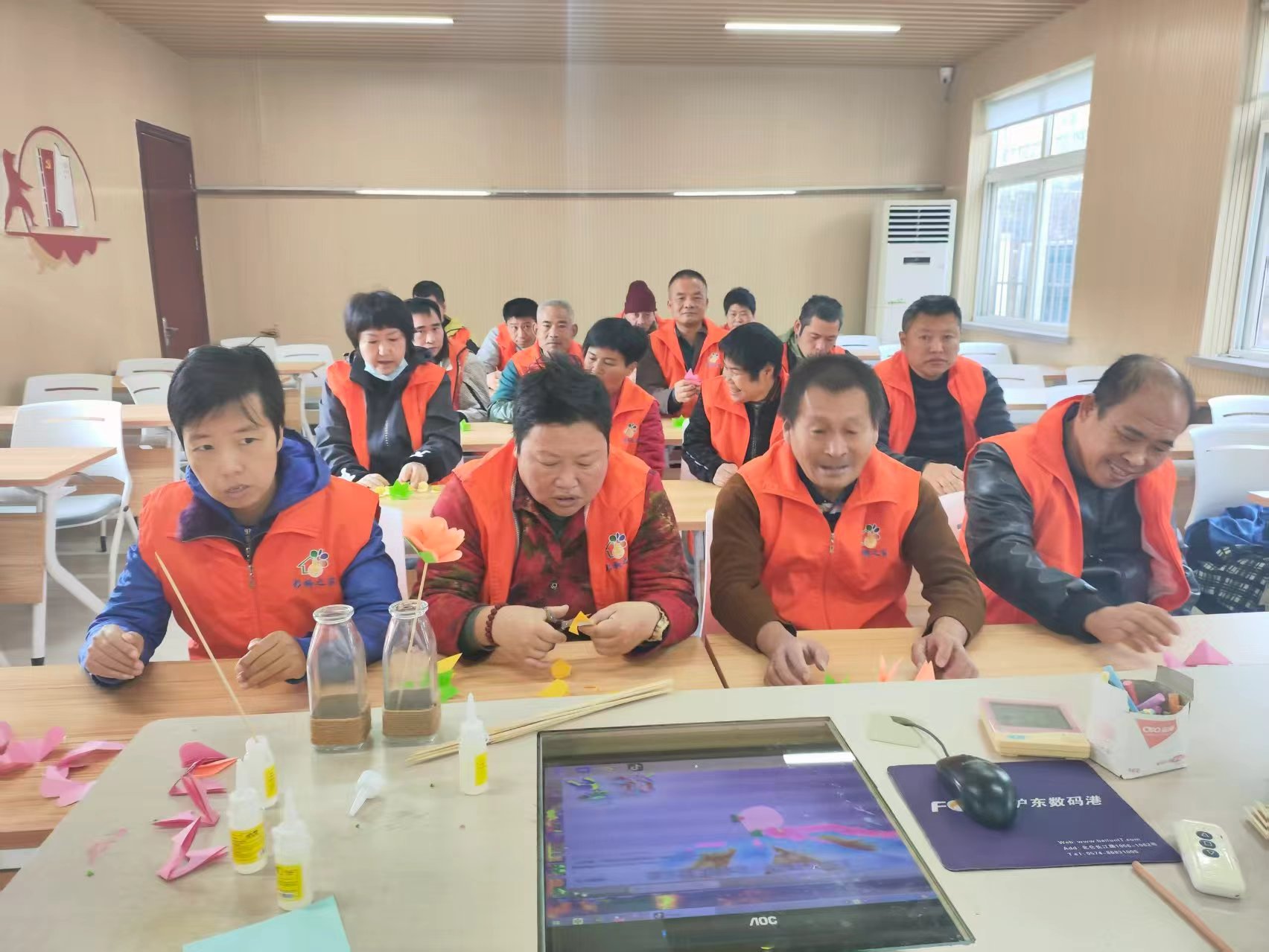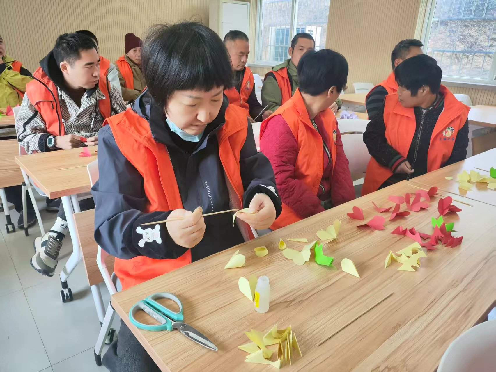 “先把彩纸对折三次,像折扇子一样慢慢翻折……”老师放慢语速,手把手指导学员操作。视力障碍的老胡指尖摸索着纸边,在老师的口述引导下一点点对齐折痕;手部活动不便的王哥用特制的固定夹夹住彩纸,另一只手艰难却坚定地完成折叠,额角渗出细密的汗珠也顾不上擦。课堂上没有催促,只有耐心的鼓励:“对,就是这样,再调整一下角度就更漂亮了”“你看这花瓣多舒展,比我折的还好呢”。