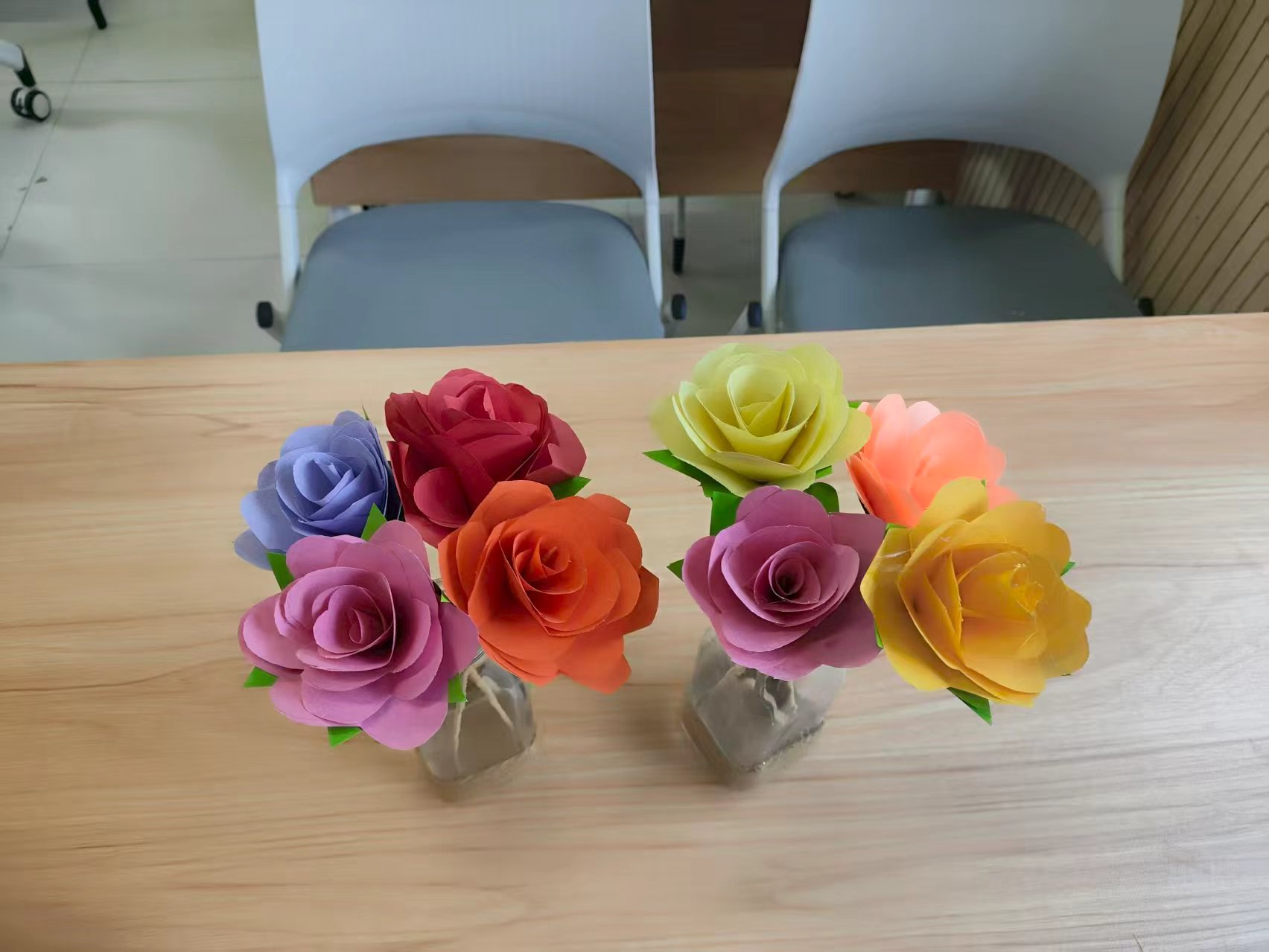 彩纸在指尖翻飞,有的学员因动作不协调反复重来,却没人轻言放弃。王哥曾因脑梗导致左手无力,起初连纸张都握不稳,在一次次折叠、粘贴中,她的手部协调性渐渐提升,当第一朵歪歪扭扭的玫瑰花成型时,她激动地举起作品:“我也能做出这么好看的花!”一小时的课堂里,活动室始终充满欢声笑语。学员们互相帮忙传递工具,分享技巧,原本有些沉默的大哥主动教旁边的大姐修剪花萼,不善言辞的姑娘耐心帮同伴整理花茎。一朵朵色彩鲜艳的玫瑰花逐渐成型,不仅装点了桌面,更点亮了大家的心情。