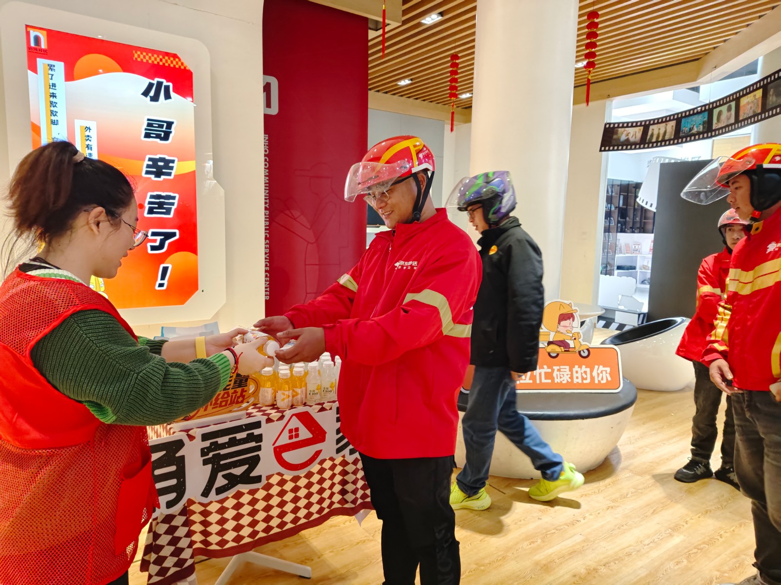 11月10日,补给站正式向骑手们开放。站内,几张整洁的桌椅静候着风尘仆仆的身影;饮料、面包等快速补能食品摆放有序,随时为路过的小哥补充体力、缓解疲惫。这里不仅是一处歇脚的驿站,更是一扇传递关怀的窗口——每一瓶水、每一份点心,都承载着社区对新兴就业群体最质朴的关怀。