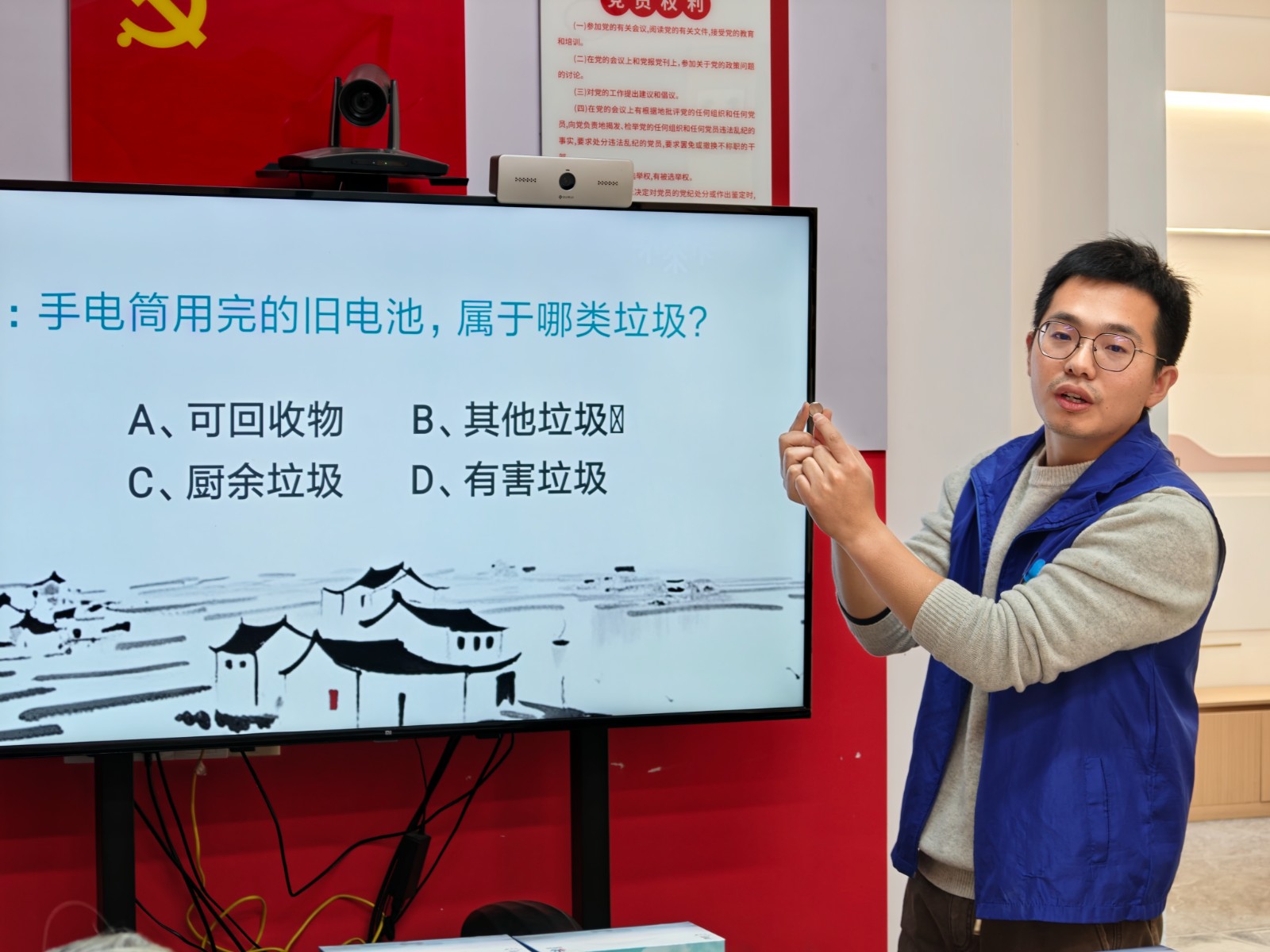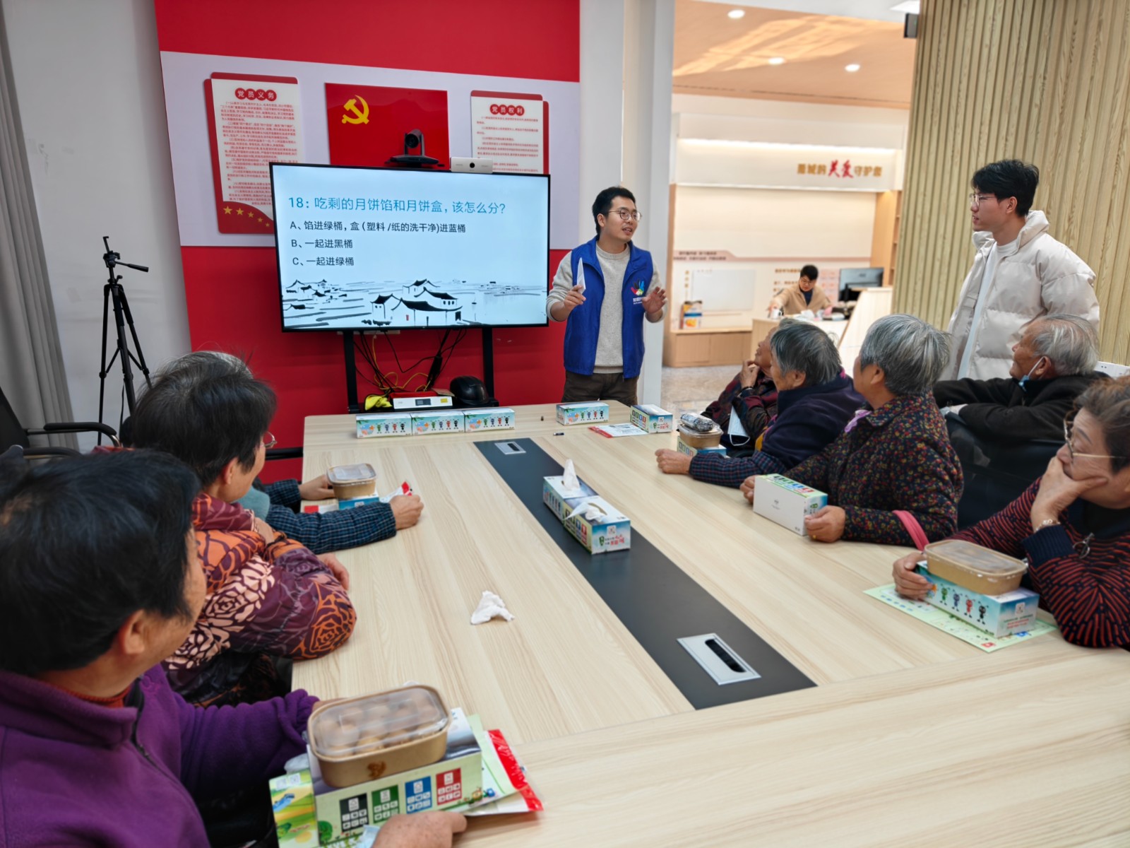“阿公阿婆,咱们宁波的厨余垃圾桶是绿色,有害垃圾要投红色桶,记不住的话,就想‘绿桶烂、红桶毒’!”11月21日上午,宁波市镇海区九龙湖镇思源社区活动室内暖意融融,20余位老年居民围坐一堂,一场专为银发群体定制的垃圾分类宣传讲座热闹开讲,用“知识讲解+有奖竞答+有害垃圾兑换”的形式,让环保理念从“听懂”落到“行动”。