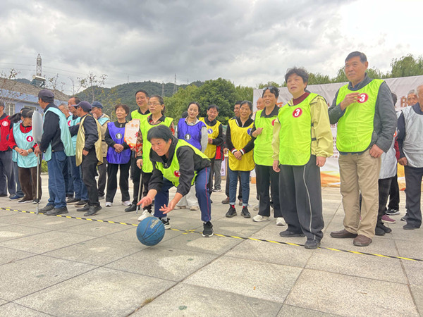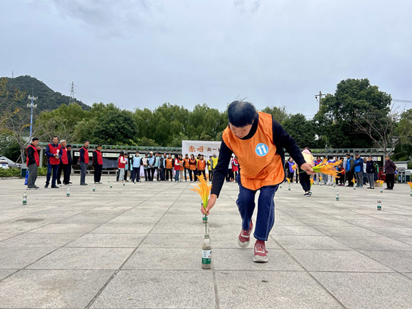 本次比赛由辖区11家经济合作社和1个行政村共12支“银龄”队伍参赛。比赛开始,“插秧能手”比赛环节尤为引人注目。比赛现场,预设的12个矿泉水瓶整齐排列,仿佛一片等待耕耘的稻田泥洞。随着裁判的一声令下,队员手持秧苗,迅速从起点出发,沿着指定路线将秧苗精准地插进矿泉水瓶中,再返回起点,交接给下一名队员。运动会还设置了翻滚保龄球、趣丢沙包、铁环接力、星球救援及插秧能手等多个适合60周岁以上参赛选手的项目,让比赛充满了趣味性和挑战性。周边居民们自发聚拢,为参赛队员们当起了“啦啦队”。