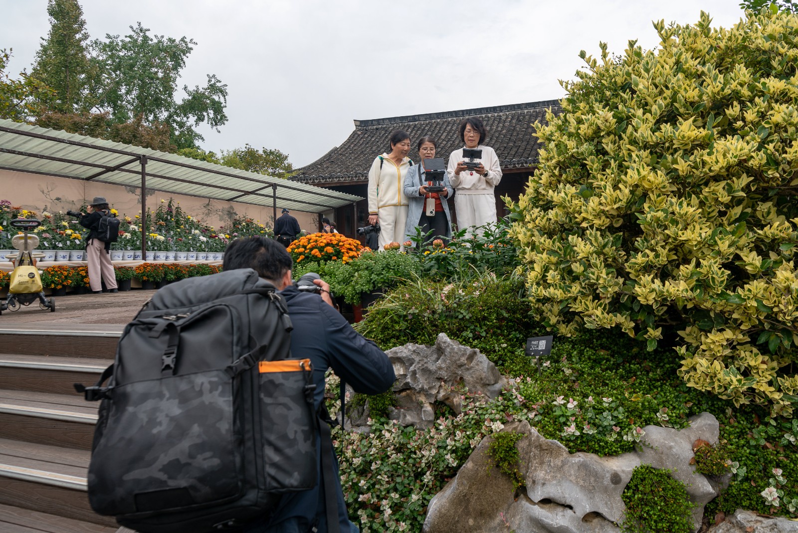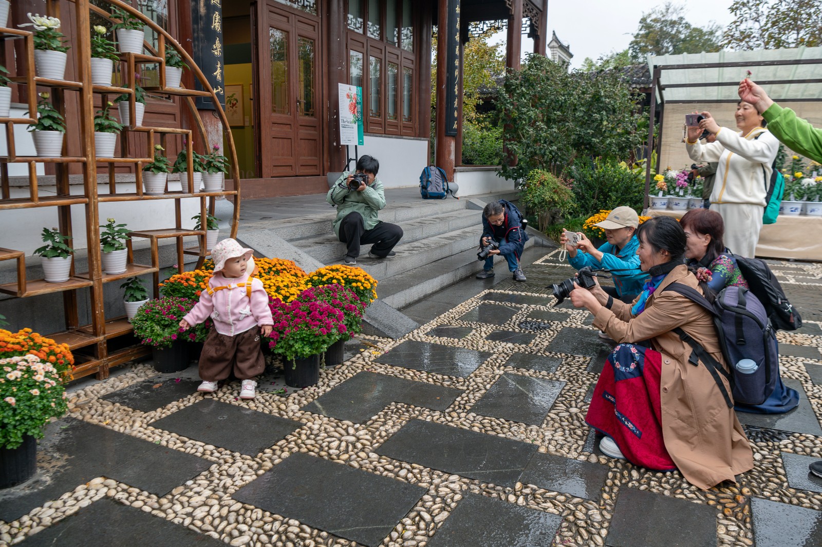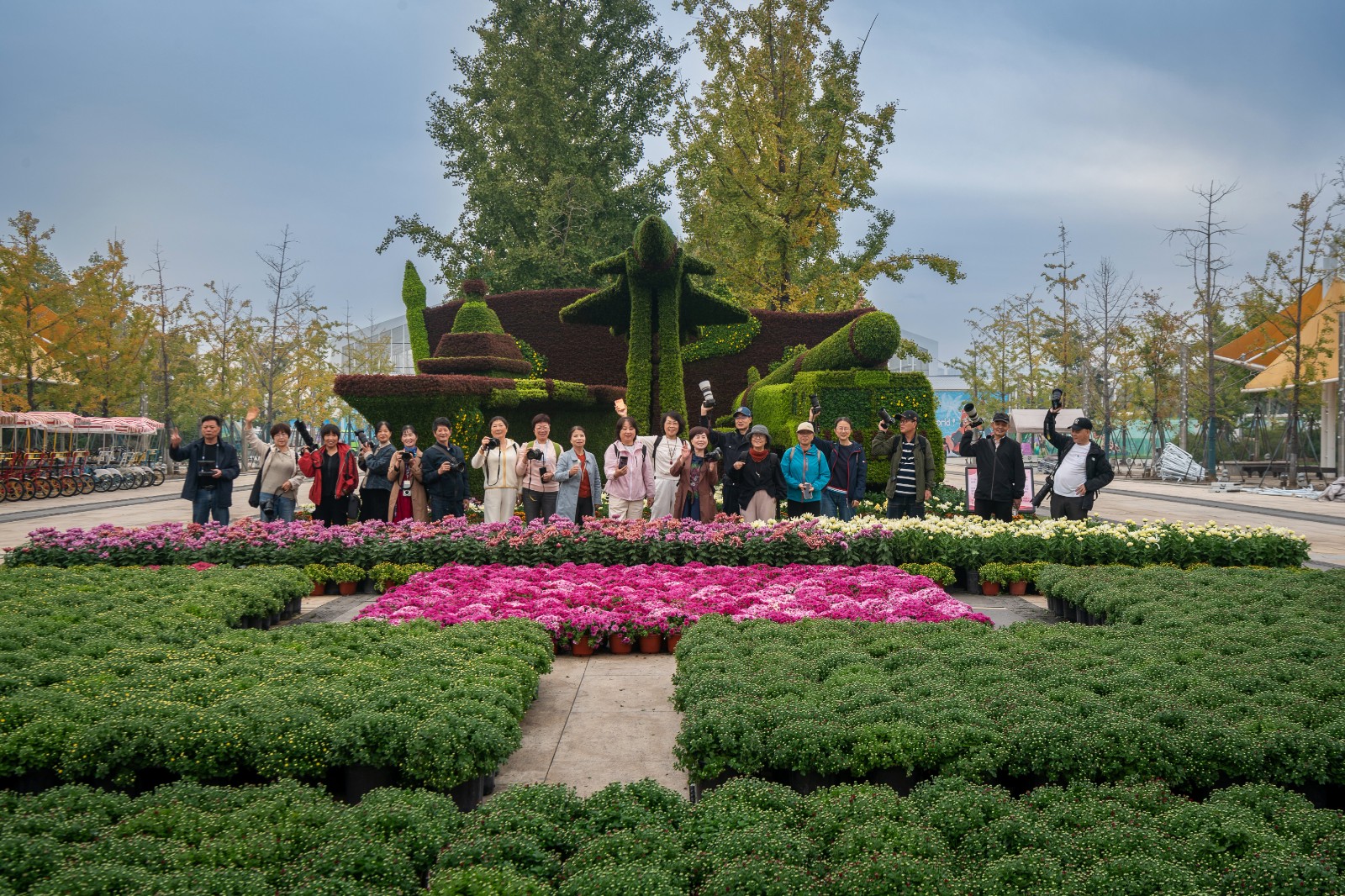 抵达兰园后,这里同样是菊花的 “海洋”—— 各色菊花在雨中傲然挺立,有的花瓣向上舒展、承接雨珠,有的垂落如瀑、沾雨轻颤,与兰园的雅致景致相得益彰。学员们不仅专注拍摄细雨中的菊花,更将镜头对准人与菊的互动:孩子们在菊花丛中追逐奔跑,清脆的笑声伴着花瓣轻颤;游人们举着手机、相机,在菊花前驻足打卡,脸上洋溢着惬意的笑容。这些充满生活气息的画面,成为学员们镜头下的 “温情素材”,大家用细腻视角记录下人与自然、人与生活的和谐瞬间,让摄影作品不仅有 “雨景之美”,更有 “人情之暖”。