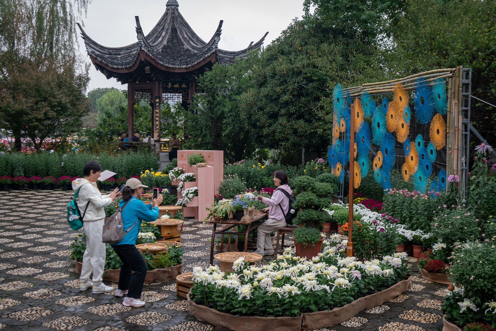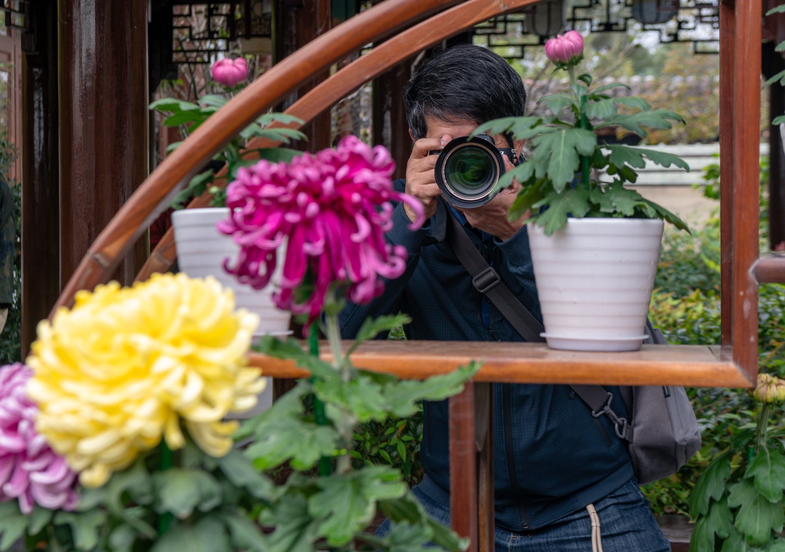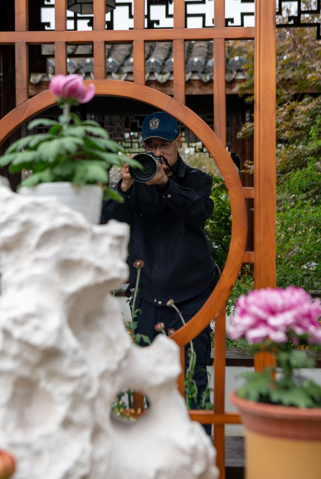 抵达兰园后,这里同样是菊花的 “海洋”—— 各色菊花在雨中傲然挺立,有的花瓣向上舒展、承接雨珠,有的垂落如瀑、沾雨轻颤,与兰园的雅致景致相得益彰。学员们不仅专注拍摄细雨中的菊花,更将镜头对准人与菊的互动:孩子们在菊花丛中追逐奔跑,清脆的笑声伴着花瓣轻颤;游人们举着手机、相机,在菊花前驻足打卡,脸上洋溢着惬意的笑容。这些充满生活气息的画面,成为学员们镜头下的 “温情素材”,大家用细腻视角记录下人与自然、人与生活的和谐瞬间,让摄影作品不仅有 “雨景之美”,更有 “人情之暖”。