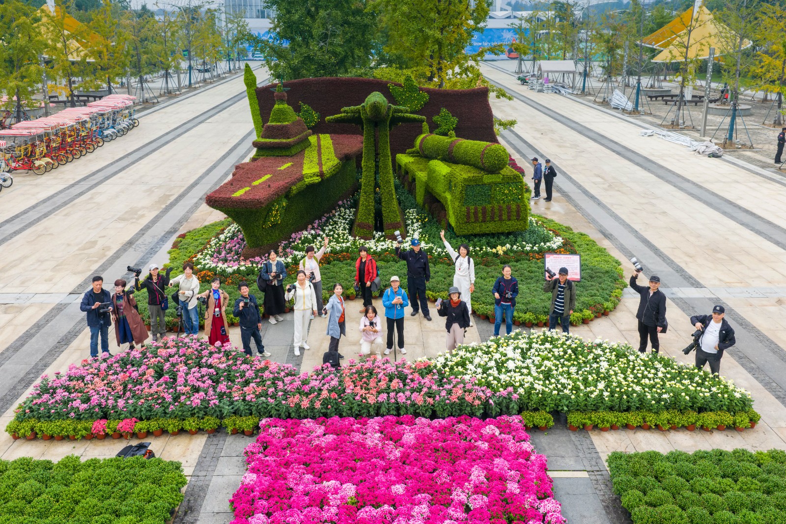 活动当天虽细雨淅沥,却未减学员们创作的热情。大家首先齐聚宁波植物园一号门广场,这里的菊展造景《大国重器》在雨雾中更显独特韵味,自然也就成为此次拓展课的 “核心亮点”。造景巧妙将形态各异、沾着雨珠的菊花与 “武器” 元素创意融合 —— 金黄的菊瓣似裹着薄纱的铠甲,轻垂的粉色花团沾着水珠,中和了 “重器” 的硬朗感。这一设计不仅展现园艺与艺术的融合之美,更以具象场景诠释和平愿景的宏大深邃,让在场师生深刻体会 “以器护和平,以花喻美好” 的内涵,抒发了对美好生活的向往及对世界和平的祈愿。学员们在此驻足良久,品味着园艺与美学融合的巧思,随后在景前合影,留下雨中难忘的一幕。