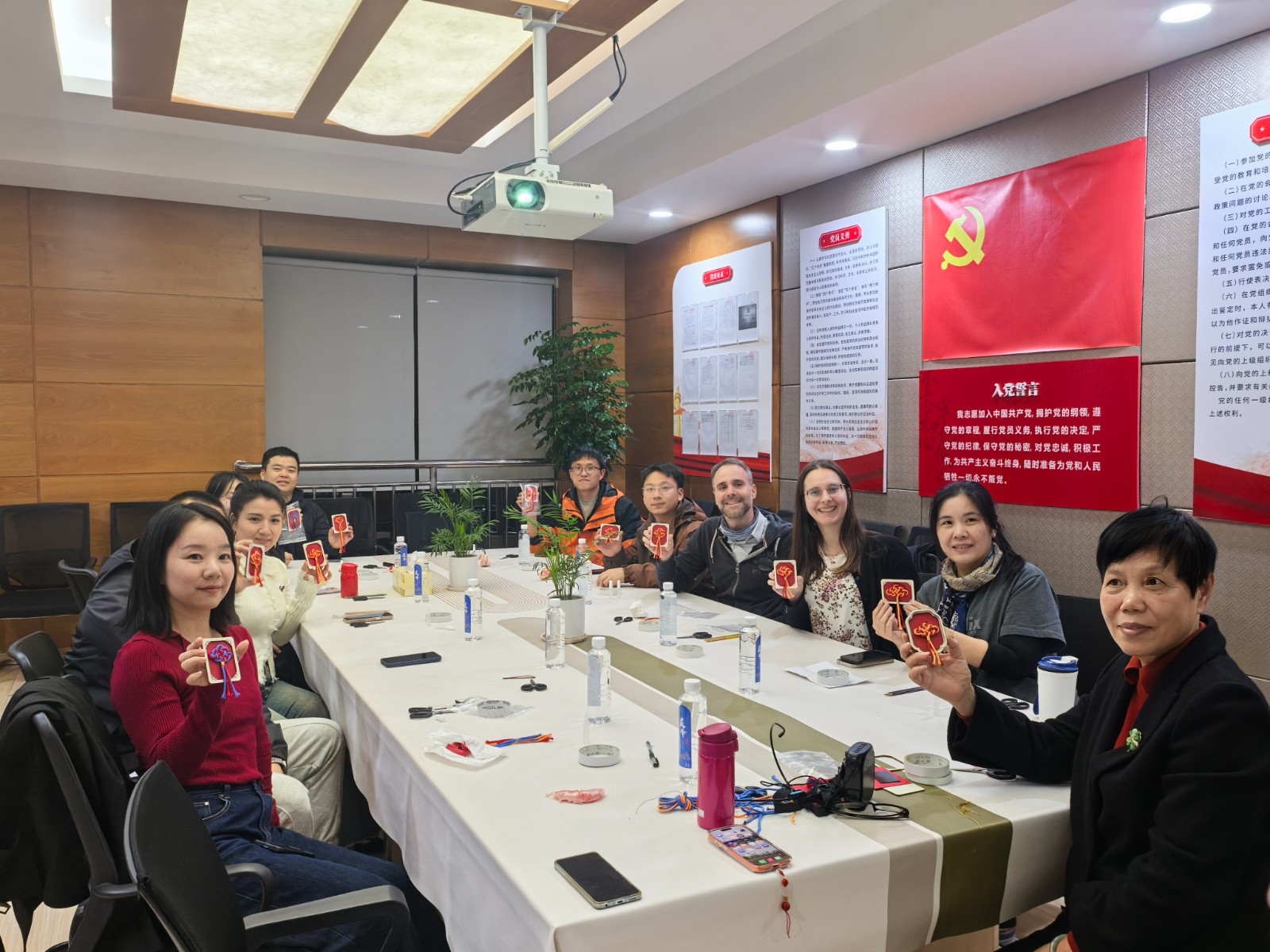 This knot means ‘good luck’!就像我们英语里的knot,既是绳结,也是紧密联系的意思。活动现场,宁波市非物质文化遗产绳编技艺(北仑绳编技艺)代表性传承人手工老师孙人建老师,为大家讲解中国结的文化内涵与编织技巧。职工们跟着指导,一挑一压地绕着红绳,遇到卡壳时,用简单的英语提示Turn left”“Pull gently,教室里此起彼伏的慢慢来!”“太漂亮了!交织成特别的双语交响曲。有职工悄悄说:平时在英语角练口语总怕说错,今天为了做好中国结,大家自然就聊开了!