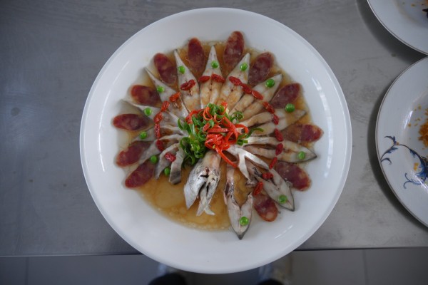 更令人称绝的是其风味的巧妙融合。虞阿姨独具匠心地融入了北仑家喻户晓的“大阿嫂”手工腊肠。腊肠的咸香醇厚,与东海鲳鱼的清甜鲜美在蒸制过程中相互渗透、交融升华。入口瞬间,先是感受到鲳鱼的极致鲜嫩,继而腊肠的馥郁风味在舌尖层层绽放,鲜而不腻,层次丰富,一口之间,仿佛尽尝了北仑山与海的壮阔对话,堪称山海风味碰撞的绝妙佳作。