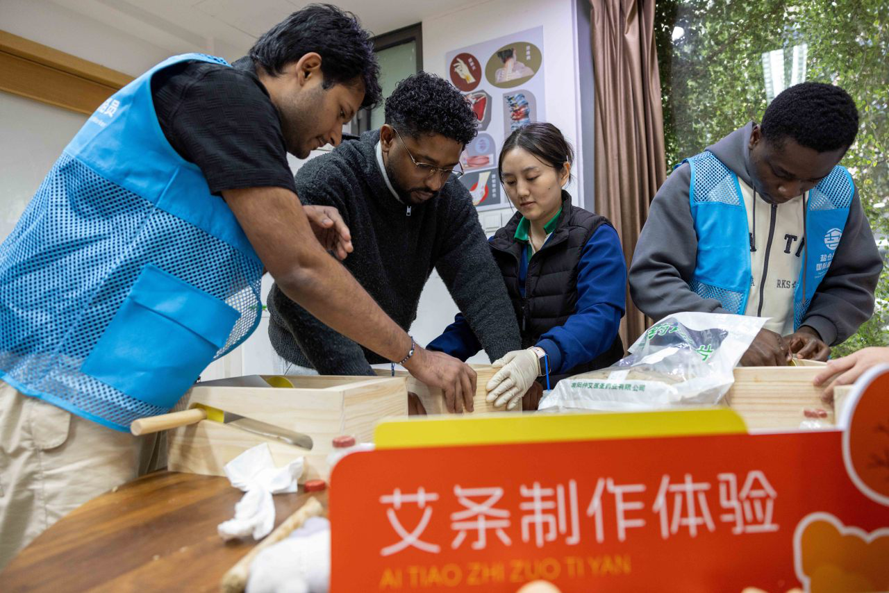 活动现场的“杏林暖意”中医便民文化市集,成为联接中外志愿者的独特纽带。来自各国的志愿者与本地“骑士网格员”一起,在专业人员的指导下亲手卷制艾条、辨识药材,体验艾灸、推拿和“望闻问切”四诊,直观感受中医的整体观哲学。同时,室外便民摊位提供阿胶制作展示、健康咨询及定制养生茶饮等服务。这种以体验为媒介的方式,跨越了语言与文化边界,使中医药文化成为关于健康、平衡与和谐的共同语言,在志愿者心中播下理解的种子。