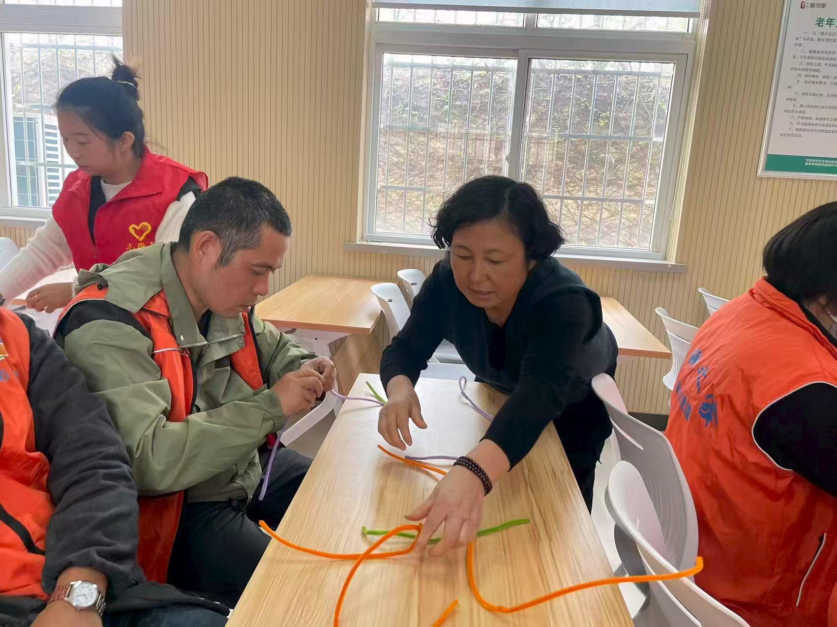 “先把毛根弯成小钩子,不用急,咱们慢慢调弧度,像给葫芦安个小尾巴。”李老师的声音轻得像落进棉花里,目光却能精准接住每个学员的动作:肢体不便的学员刚把毛绒球按在铁丝上,她就轻轻扶稳材料,再让对方用胶带一圈圈缠牢;视力障碍的学员伸手摸向桌面,她会把毛根递到指尖,念叨着“这根是绿的,比刚才那根粗一点,你捏的地方是葫芦的‘肚子’”;进度慢的学员盯着手里歪扭的葫芦柄发呆,她就蹲下来,重新捏着对方的手,带着指尖慢慢弯出柔和的曲线。