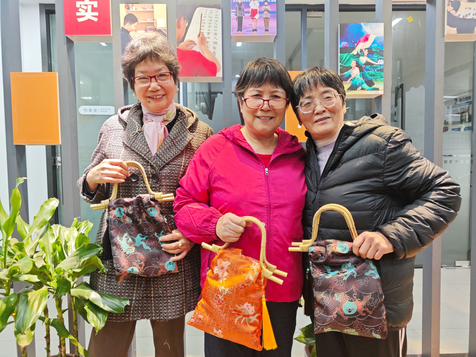 叔叔阿姨们围坐一堂,纷纷化身“巧手匠人”,穿针引线间尽显专注。遇到拿捏不准的缝合步骤,便主动向老师请教,或与身旁“老伙伴”热烈探讨;瞧见邻座卡壳犯难,又欣然搭手相助。随着最后一针收线,绸缎与竹柄完美相合,20余件独具匠心的国风旗袍包惊艳亮相。“既能学手艺,又能交朋友,这样的活动我们太喜欢了!”李阿姨捧着自己的“得意之作”,笑得合不拢嘴。大家纷纷举起包包合影留念,用镜头定格下这满溢的成就感与幸福感。