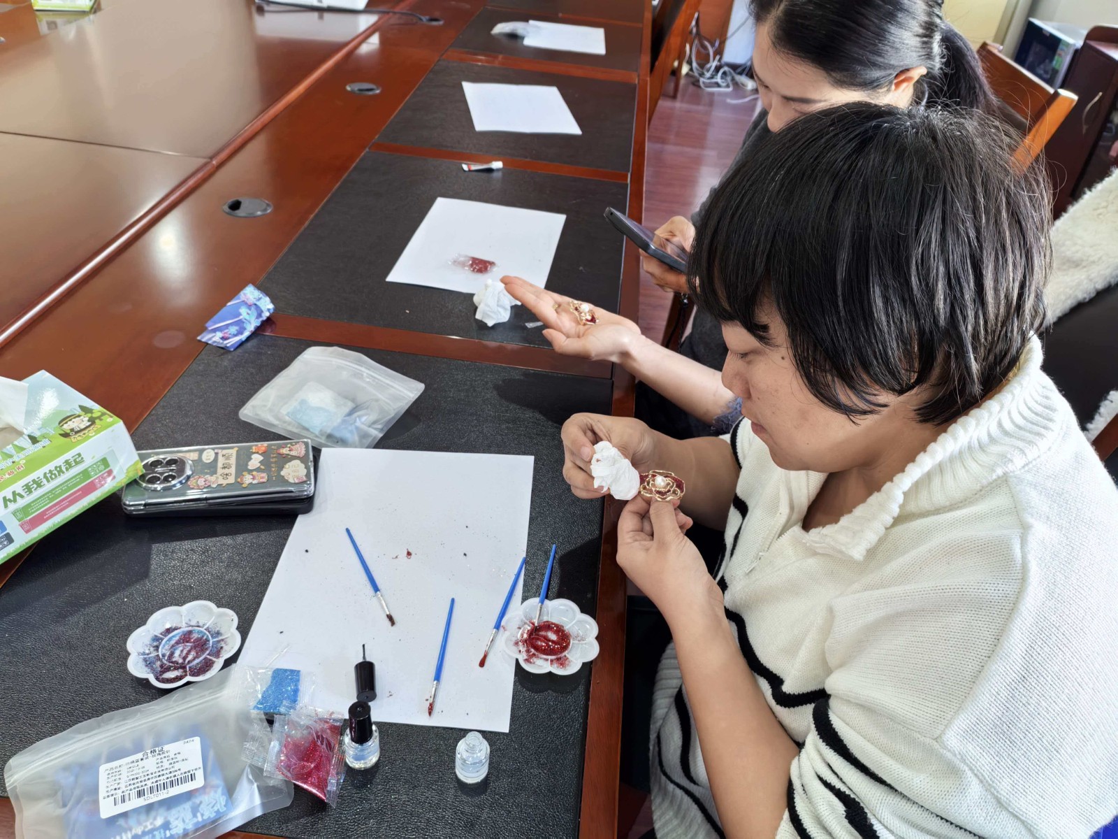 活动中,妇女们热情参与,亲手制作精美胸针。通过实践,她们不仅制作了精美胸针,还增强了文化自信和团队协作精神。