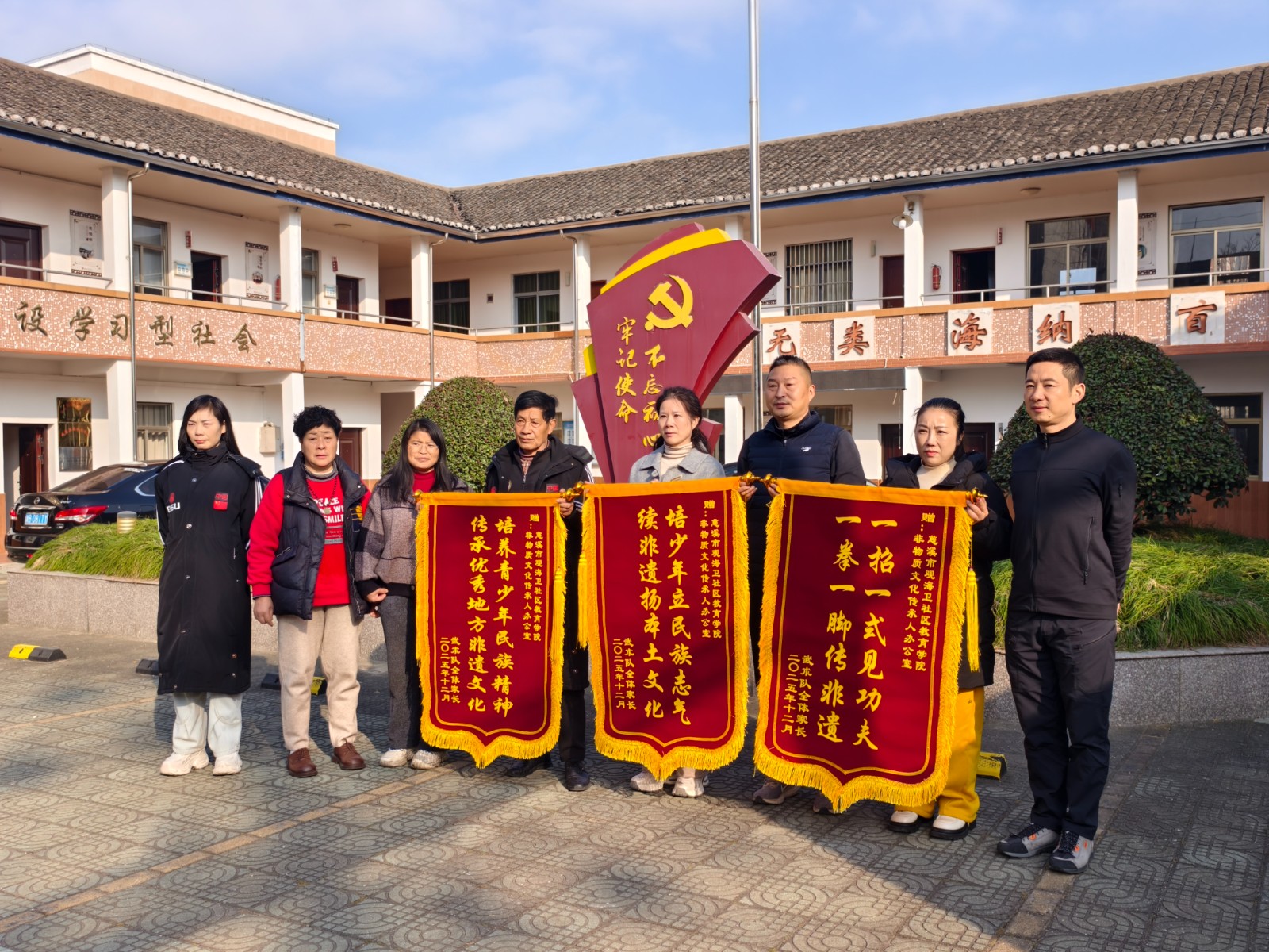 12月18日,冬日暖阳,观海卫社区教育学院迎来更暖心一幕。戚继光传统武术队的几位家长代表手持鲜艳锦旗来到学校,将写有“培少年立民族志气,续非遗扬本土文化”的锦旗送到学校团队领导手中,以此表达对学校“非遗进校园”项目的诚挚感谢。