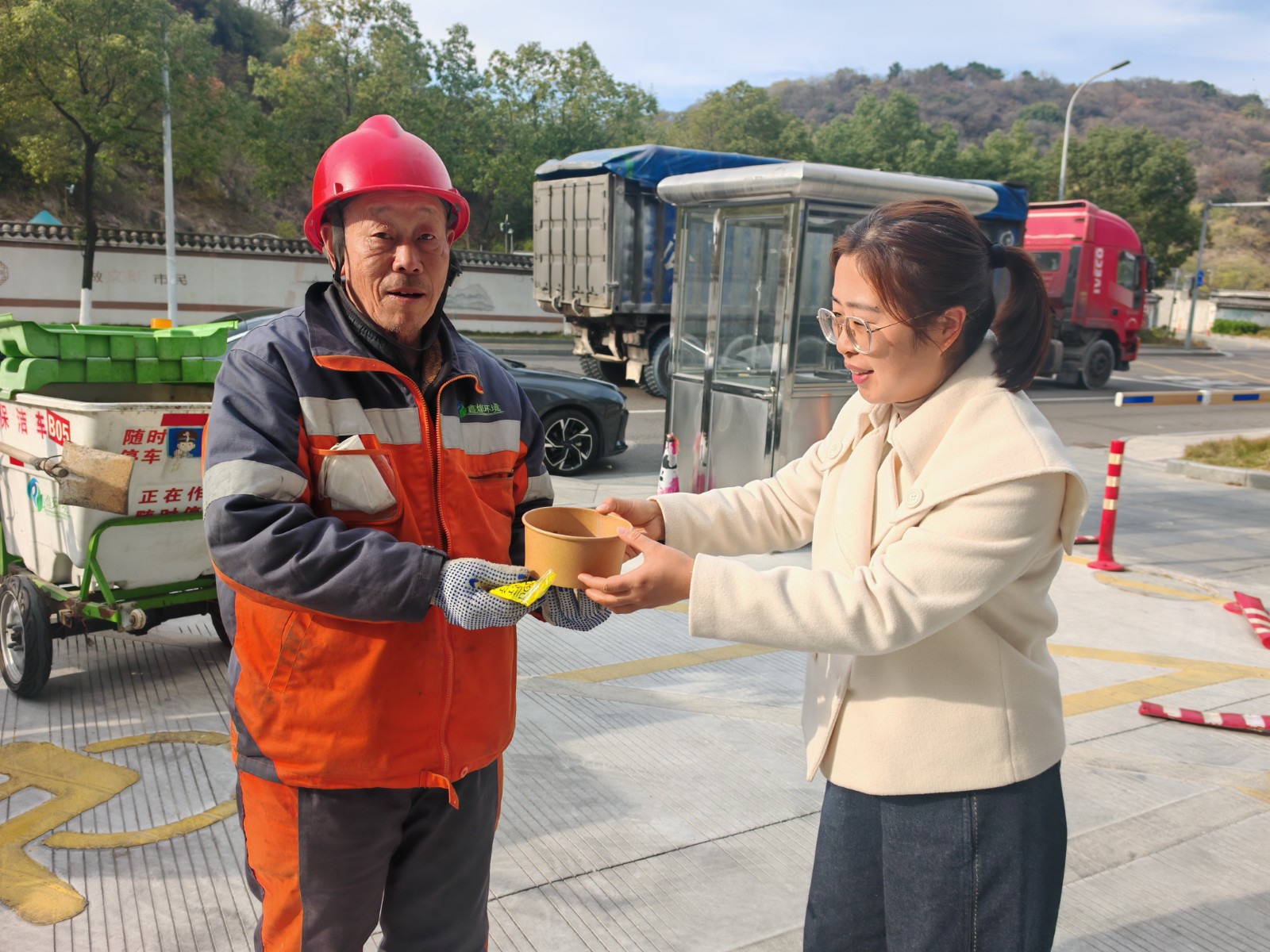 经过小时的忙碌,数百颗饱含爱心的汤圆终于完成。煮熟之后,社区工作人员将这些汤圆分装进碗中中,由亲子家庭代表和社区志愿者组成送温暖小分队,分头前往送至环卫工人和快递小哥、货车司机等新就业群体的手中