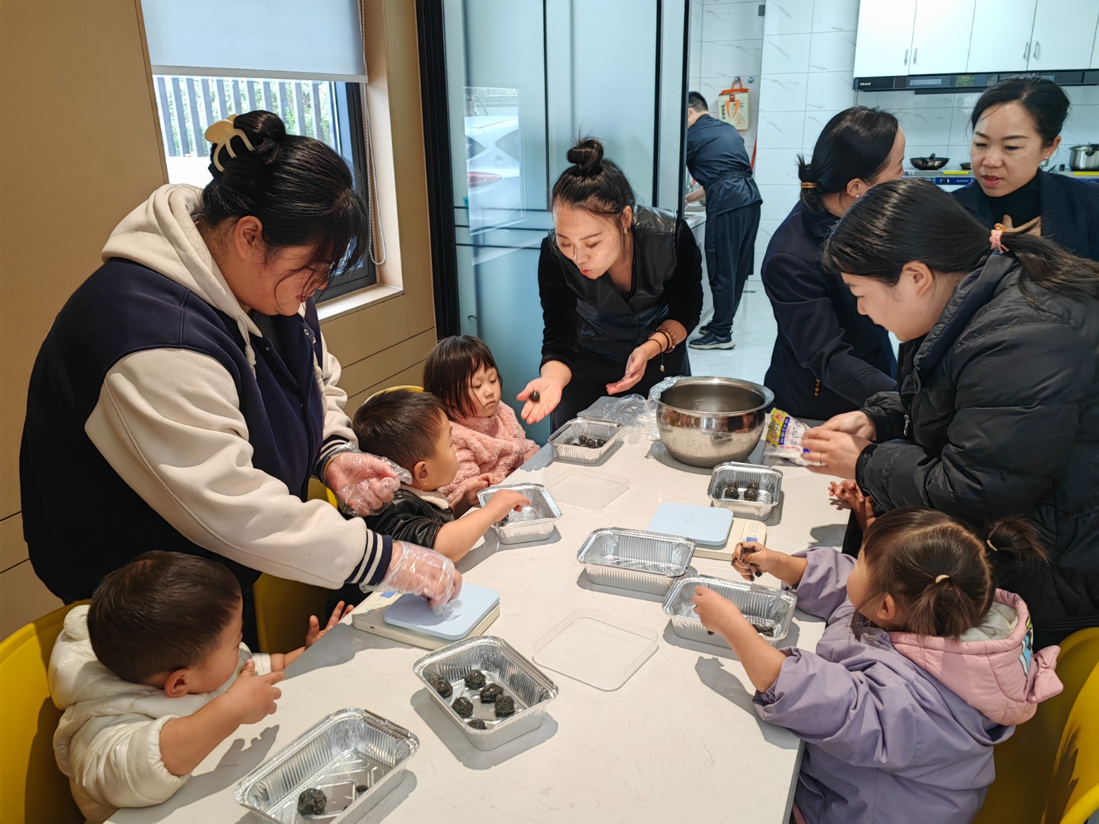 墩墩乐美厨娘食光站已被精心布置,长桌上整齐摆放着糯米粉、芝麻馅、豆沙馅等原料,空气中弥漫着淡淡的糯米香。孩子们在指导下,认真学着和面、包馅、搓圆,虽然动作略显生疏,但每个人脸上都洋溢着专注与喜悦。