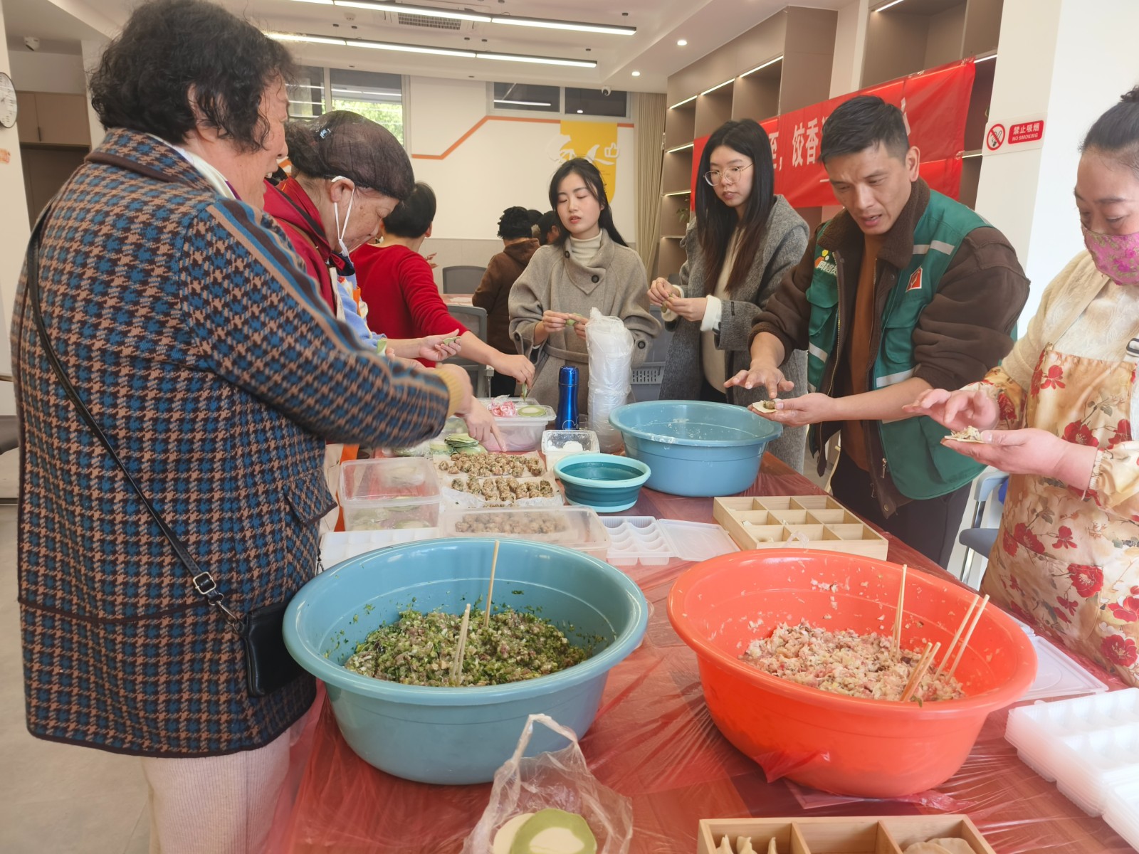 下午的南北美食比拼环节,将活动推向高潮。居民们各显神通,擀皮、包馅动作麻利,元宝饺、柳叶饺、福袋饺轮番登场,造型别致;汤圆则裹着芝麻馅,圆润饱满像一个个小灯笼。“南北美食大比拼太有意思了!我跟着东北邻居学了新的饺子包法,还能给辛苦的外卖小哥、快递员送份暖,这样的‘共享温情’太让人暖心了!”手里捏着花式饺子的程阿姨,笑得合不拢嘴。大家在切磋技艺中交流民俗,欢声笑语溢出老邻舍能人驿站。活动尾声,社区工作人员与热心志愿者提着沉甸甸的保温袋,将热乎的饺子、汤圆送到寒风中的外卖小哥、快递员手中。“天这么冷,收到这份冬至礼物太惊喜了!感觉自己被社区记挂着,浑身都暖和了!”快递员小刘捧着温热的美食,连连道谢。