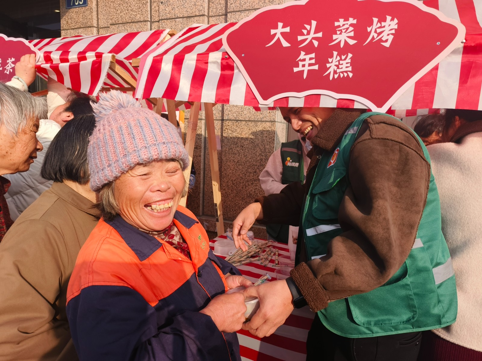 一大早的美食制作区堪称“烟火聚集地”,若干志愿者阿姨分工合作,清洗大头菜,削皮切块,一块块厚厚的大头菜寓意着“来年家境殷实、平平安安”,在菜油、酱油和糖的魔力下,甜香混着咸鲜勾得人食指大动。一旁的番薯汤果则咕嘟咕嘟冒着泡泡,让人心里暖洋洋的。这两大锅冬至美食和姜茶一同被送到了居家养老服务站的门口,瞬间便吸引了满满的人气。“跟老姐妹们一起做冬至吃食,看着大家吃得热乎,我这心里比汤果还甜!” 正忙着分盛姜茶的马阿姨,脸上笑出了眼角纹。另一边的便民服务摊位前更是排起小长队,理发师傅手起刀落修剪利落,医护志愿者细心测量血压、讲解健康知识,缝补摊位上针线穿梭。“社区太贴心了!冬至不仅有热乎吃的,还能免费理发量血压,我们的日子是越来越好了!”刚理完发的张爷爷摸着清爽的发型,竖起大拇指连连点赞。