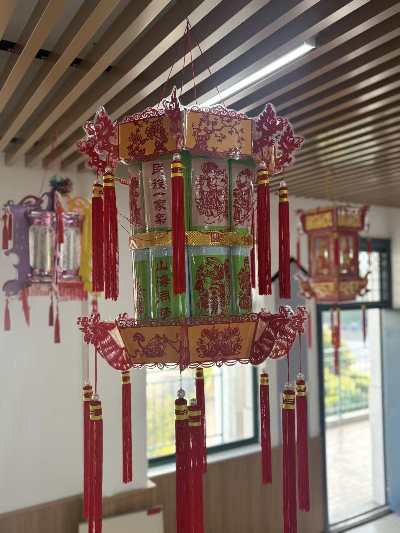 之后,大家把剪纸作品与北仑宫灯制作技艺相融合,经过塑封、裁剪、粘贴等多道工序,将一幅幅民族剪纸巧妙地组装到宫灯灯面。八角、六角等不同造型的宫灯上,56个民族形象错落有致,点亮灯光后,剪纸图案在光影中灵动鲜活,既保留了传统宫灯的典雅韵味,又融入了民族文化的深厚底蕴。