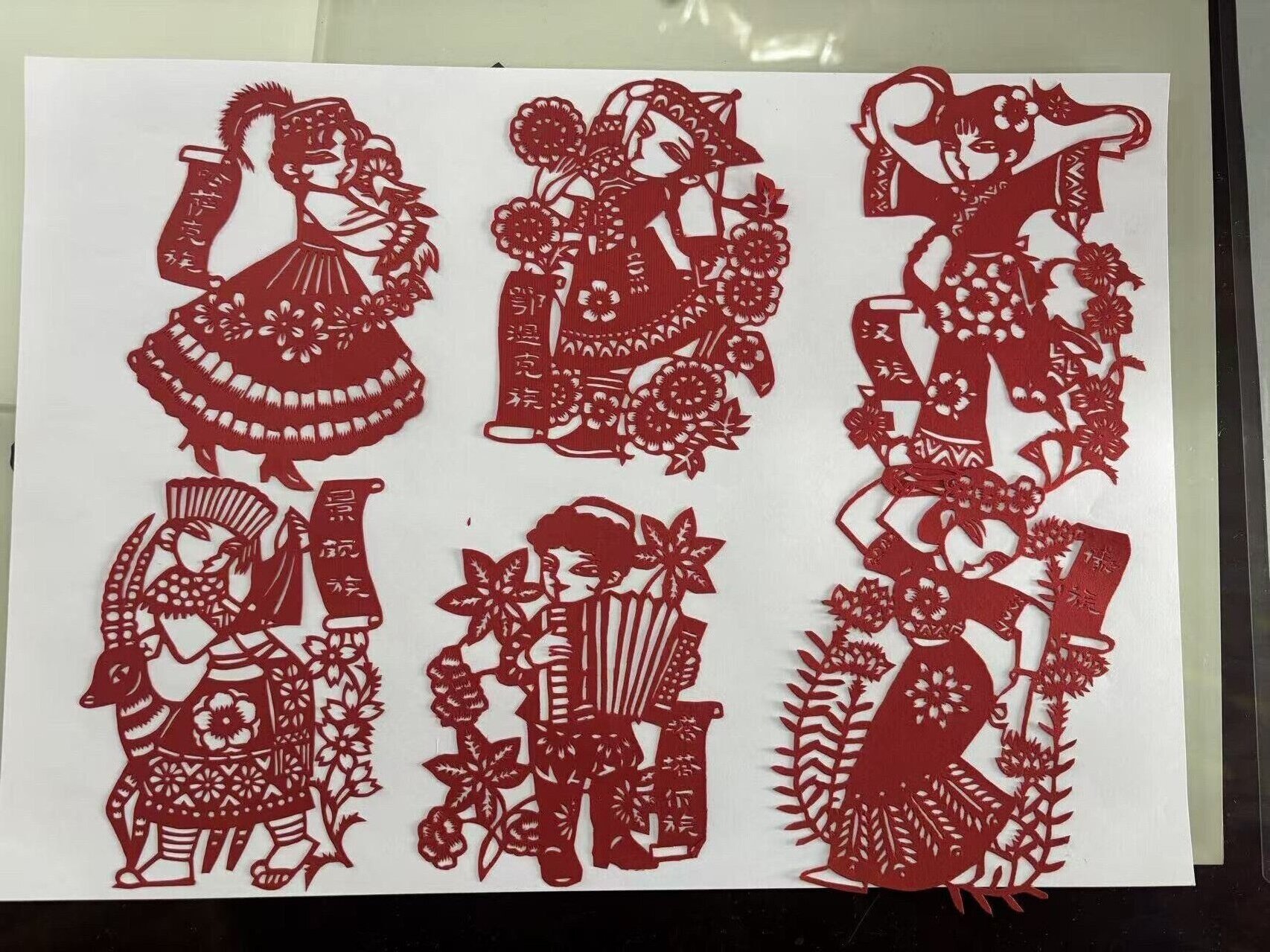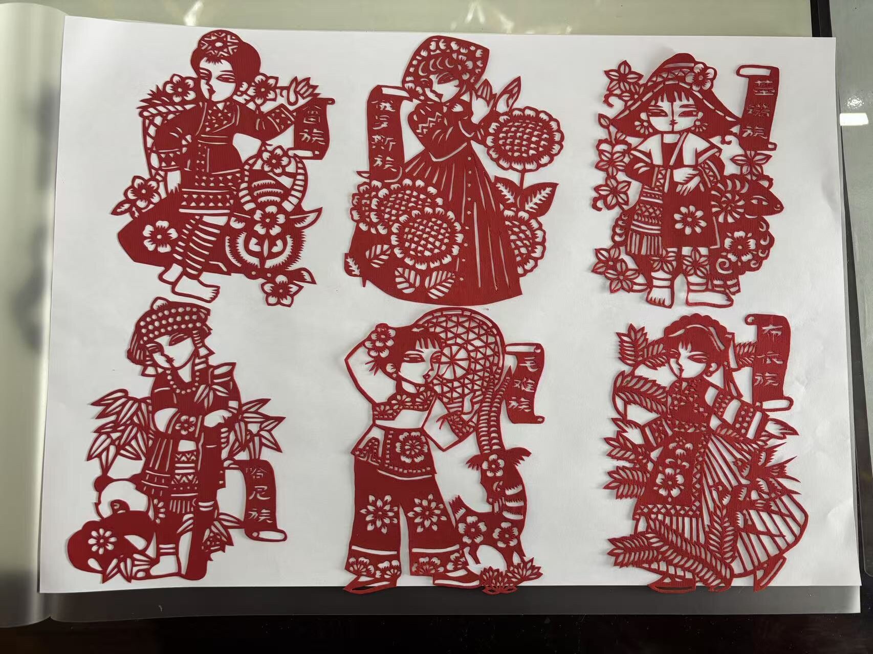 在刻绘阶段,成员们手持刻刀,全神贯注地在红纸上精雕细琢。从苗族的精美银饰、藏族的传统藏袍到维吾尔族的特色花帽,每个民族的代表性元素都被细腻呈现。经过数十天的用心创作,56幅民族剪纸作品活灵活现,人物神情各异、服饰细节饱满,充分展现出民族文化的独特魅力。