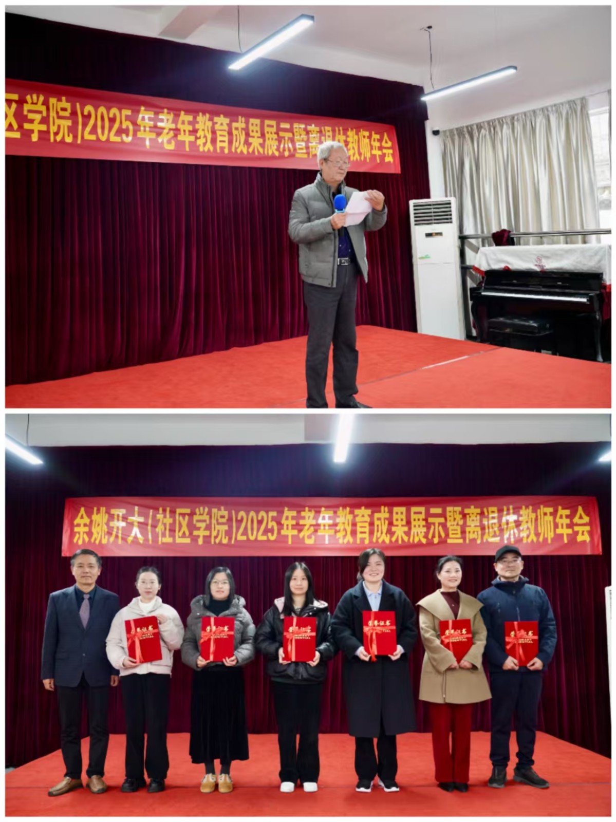 2025年12月31日上午,宁波开大余姚学院(社区学院)在校内隆重举办2025年老年教育成果展示暨离退休教师年会。本次活动以展示老年教育办学成效为核心,以凝聚离退休教师情谊为纽带,进一步搭建起学院与离退休教师的沟通交流桥梁,尽显对老年教育事业的深耕与对离退休教职工的暖心关怀。