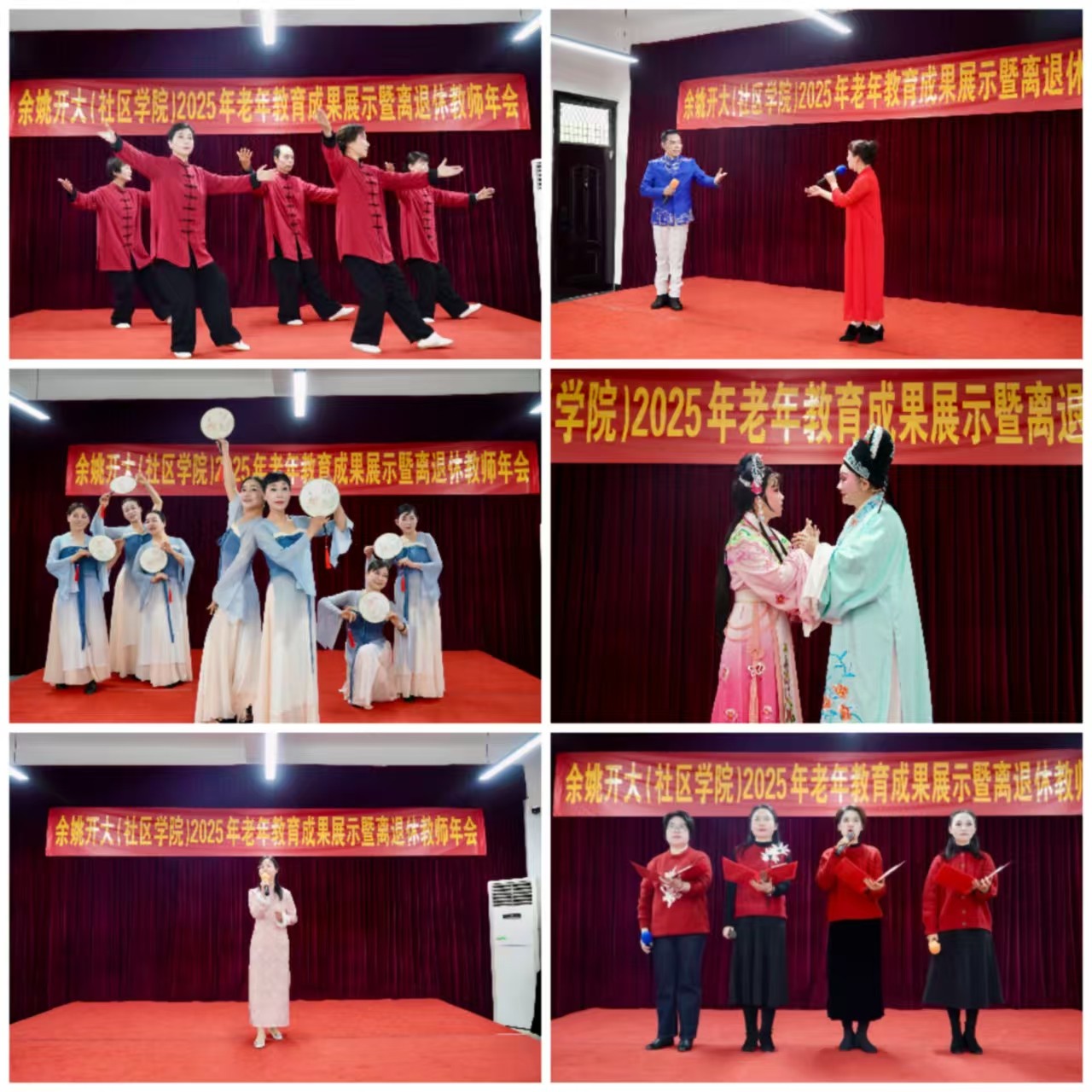 成果展示环节精彩纷呈、亮点纷呈,各类节目轮番上阵,尽显学院老年教育的丰硕成果与师生的昂扬风貌。姚剧班学员登台演绎《九斤姑娘》经典选段,地道唱腔、鲜活演绎,让传统戏曲文化焕发新生;太极拳班学员身姿舒展、动作整齐,以一套行云流水的24式太极拳,尽显中华传统武术魅力与老年学员的精气神;越剧班学员倾情表演选段《轻舟越过千里路》,扮相雅致、曲调悠扬,尽显越剧独特韵味;形体班学员身着盛装,以一支柔美灵动的舞蹈《化蝶成双》,展现出不俗的形体功底与优雅气质。老年教育成果汇演的同时,学院教师代表节目诗朗诵《永远的风华正茂》和独唱《甜蜜蜜》,更是表达了学院教师对退休前辈们的崇敬与祝福。现场同步开展老年教育优秀志愿者表彰环节,为默默奉献的志愿者们颁奖,全方位、多角度呈现出学院老年教育的教学质量与育人成效。