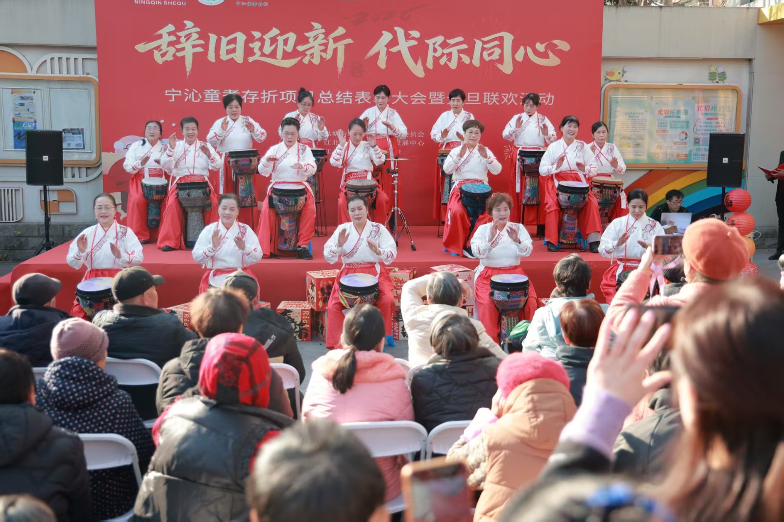 本次活动以“辞旧迎新,代际同心”为主题,旨在通过音乐搭建沟通桥梁,打破年龄隔阂,促进社区不同代际之间的理解与融合,同时丰富居民的精神文化生活。随着主持人一声热情洋溢的开场,鼓声骤起,《江湖夜雨十年灯》的旋律在鼓点中焕发出全新生命力。热烈奔放的节奏如潮水般涌来,瞬间点燃了现场气氛。学员们配合默契,不仅敲击出整齐划一的鼓点,还融入了简单而富有表现力的手部动作,使整场演出既有听觉冲击,又具视觉美感。台下观众或随节奏轻拍膝盖,或频频点头微笑,掌声此起彼伏,久久不息。