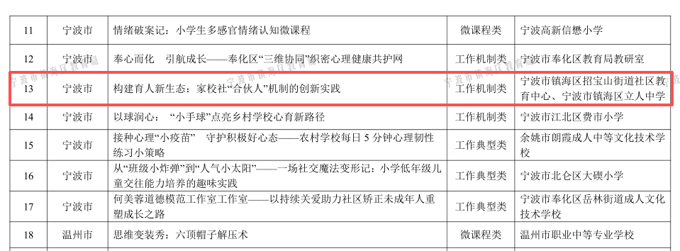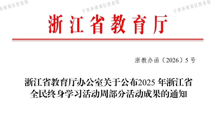 近日,从文件《浙江省教育厅办公室关于公布2025 年浙江省全民终身学习活动周部分活动成果的通知》获悉,由招宝山社区教育中心和镇海区立人中学联合申报的心育案例《构建育人新生态:家校社“合伙人”机制的创新实践》获评2025年浙江省“青苗向阳”优秀心育案例。