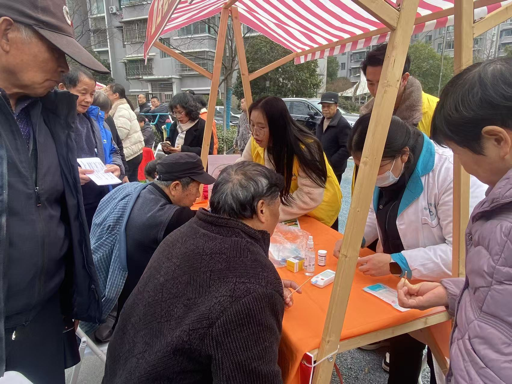 迎新市集上,老人一边量着血压,一边翻看着垃圾分类宣传册,健康管理与绿色生活在这冬日暖阳下悄然融合。