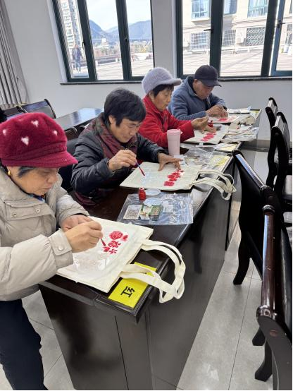 培训现场,经验丰富的社区工作人员分解拓印流程:固定布料、对准模板、均匀拍打、点缀纹样——每一步都进行慢速示范与要点讲解。重点训练微网格员“俯身陪伴、及时回应、一对一协助”的服务姿态,尤其关注手法生疏或操作不便的长者,给予手把手指导。活动不仅传授技艺,更注重情感交流。微网格员学习如何引导老人相互讨论配色、分享年货趣事,在轻松互动中拉近邻里距离,让活动场地笑语盈盈,暖意融融。