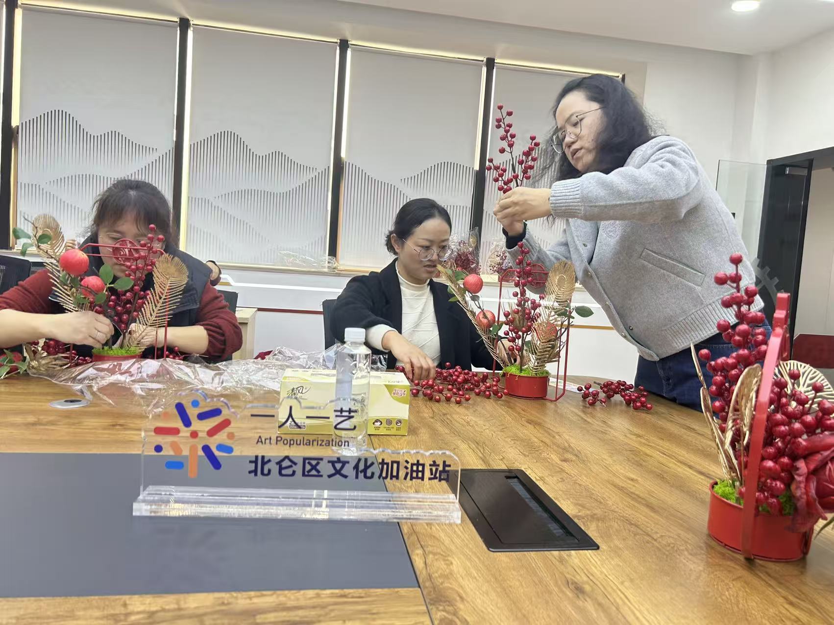 活动现场,长桌被布置成充满生机的创作台。花艺师预先准备了丰富的花材:象征“银留”吉祥的银柳、饱含喜庆的中国红冬青果、寄托思念的澳洲腊梅搭配金色丝带、红色福字挂饰,年味十足。修剪枝条、设计造型、固定主体、点缀配叶……此刻职工们全神贯注,将耐心与创意倾注于手中的方寸之间。“这个过程特别解压,看着一团团花材在自己手里变成一件漂亮的作品,心里满满的成就感。”友珈财务贺佳瑜笑着说道。她表示,繁忙的工作之余,很少有机会接触这类安静又美好的手作活动。