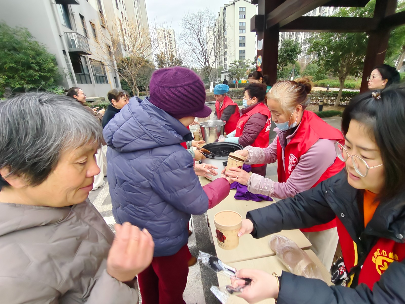 活动现场暖意融融,社区工作人员早已备好精心熬制的腊八粥。糯米、红豆、红枣、莲子等多种食材慢火细炖,熬出的粥品软糯香甜、暖意绵长。居民们有序排队领取腊八粥,一碗碗热粥递到手中,驱散了冬日的寒凉,也拉近了邻里间的距离。大家围坐在一起,品粥话家常,现场满是欢声笑语,尽显社区大家庭的和睦温情。