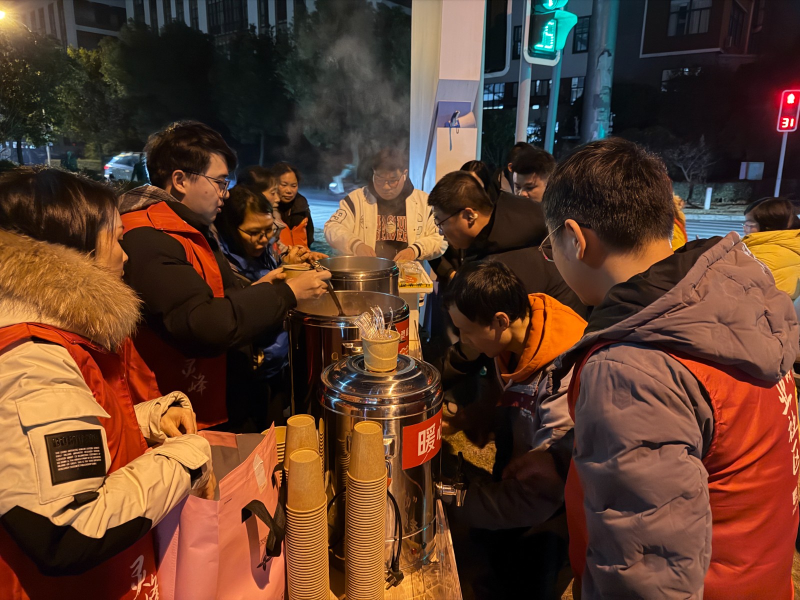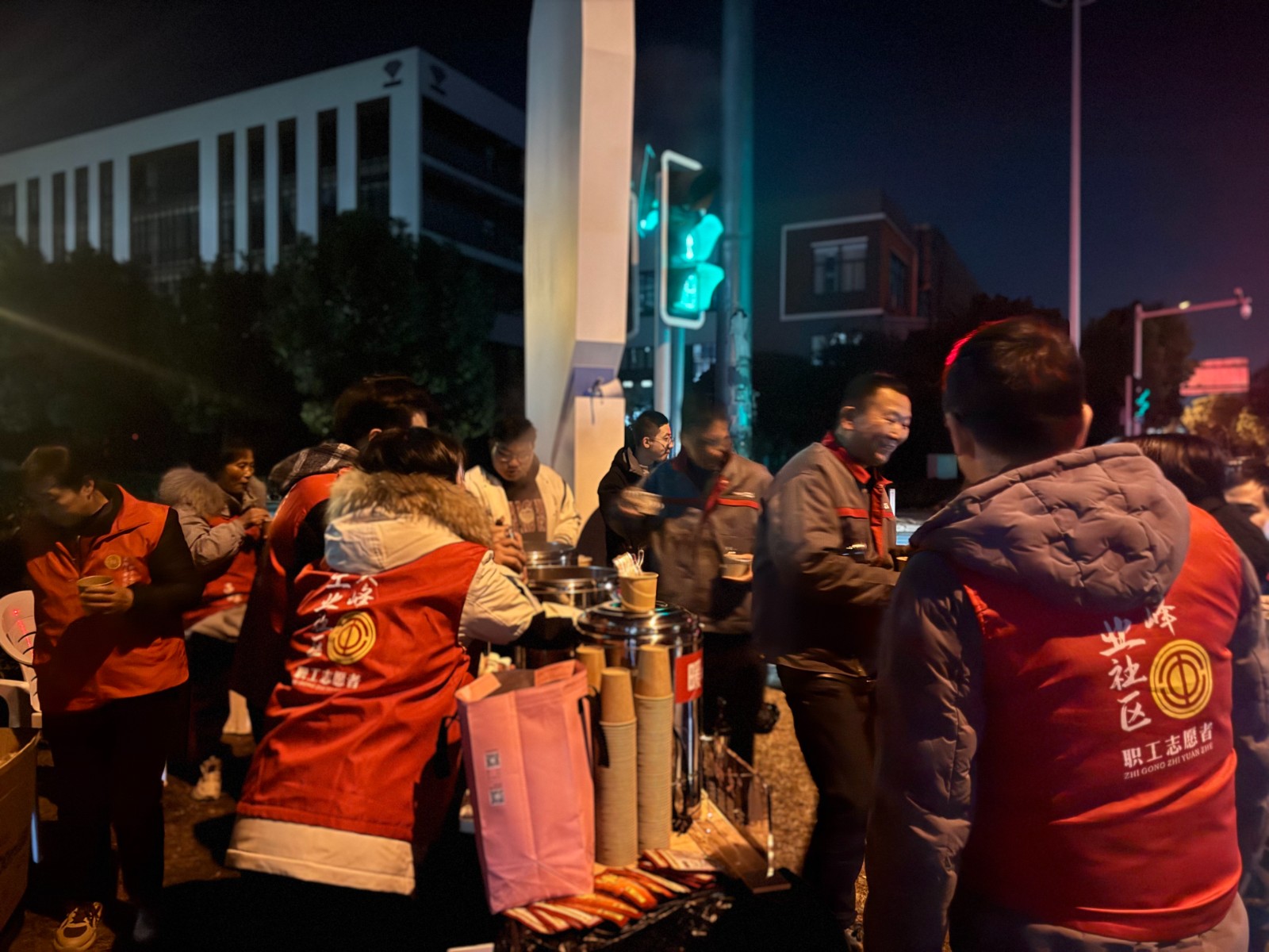 1月23日晚,灵峰工业社区党群服务中心延续“情牵晚八点”温情品牌,开展腊八节专场“暖心下班路”活动。社区流动党员和“灵动”志愿者再次走上园区枢纽点位,为晚归的基层职工送上热腾腾的腊八粥、水饺、姜茶和保暖用品,以传统节味陪伴他们穿越寒夜。