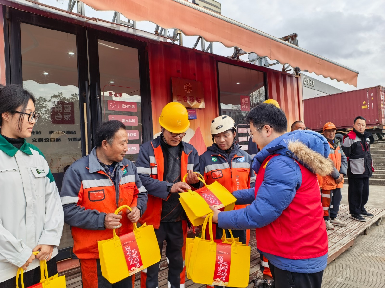 不少环卫工人和司机师傅趁着间隙来这里歇脚,一碗热粥、几句问候,让小小的驿站充满了温馨的节日气氛。工作人员早早熬制好香甜软糯的腊八粥,分装成碗,陆续送到正在奔波忙碌的劳动者手中。除了腊八粥,社区还准备了实用暖心的“冬季礼包”,包括保温杯、暖手宝等,叮嘱大家在工作时注意保暖、安全出行。“这粥料足,喝下去浑身都暖了!”快递员小一边喝粥一边感慨,“平时忙起来经常顾不上吃饭,社区总惦记着我们,太周到了。”