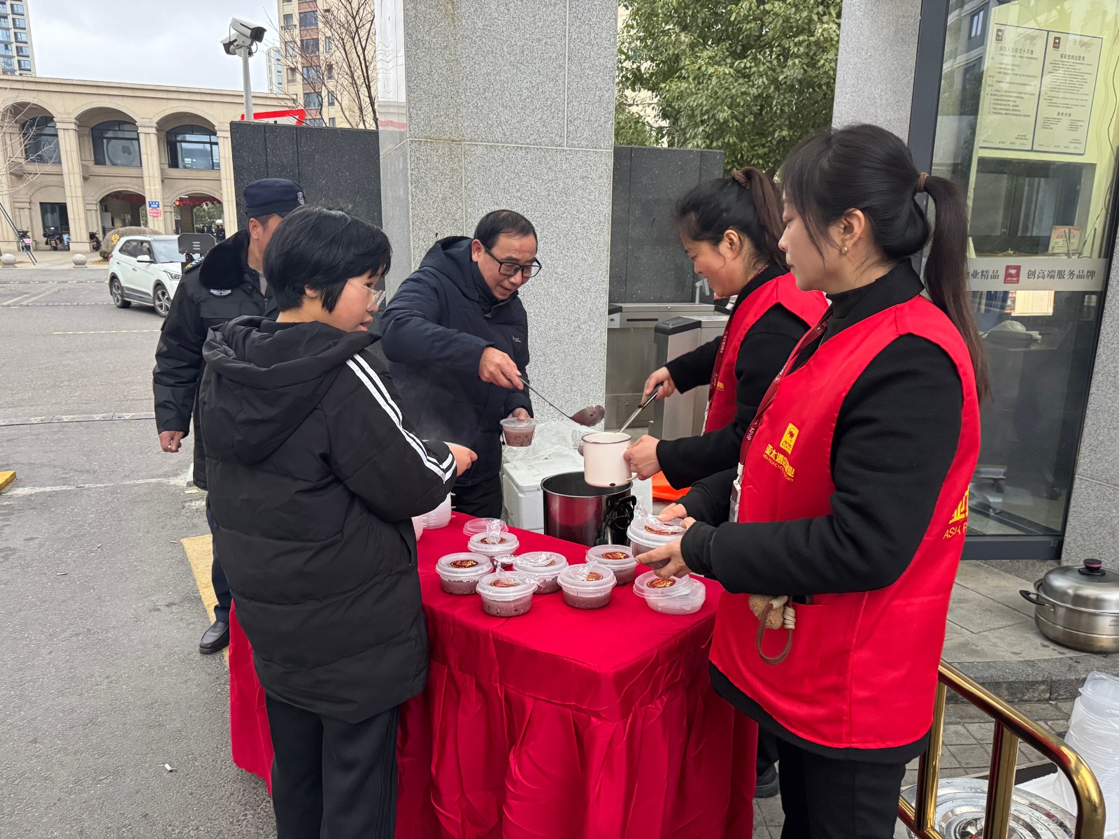 此次活动还得到了共建单位东港湾大酒店、丽筠酒店的暖心助力,两家酒店精心熬制了热气腾腾、香甜软糯的腊八粥,与社区工作人员和志愿者们一起,将这份承载着传统韵味和社区关怀的“暖意”传递到多个点位,更送到了高龄、独居老人的家里。