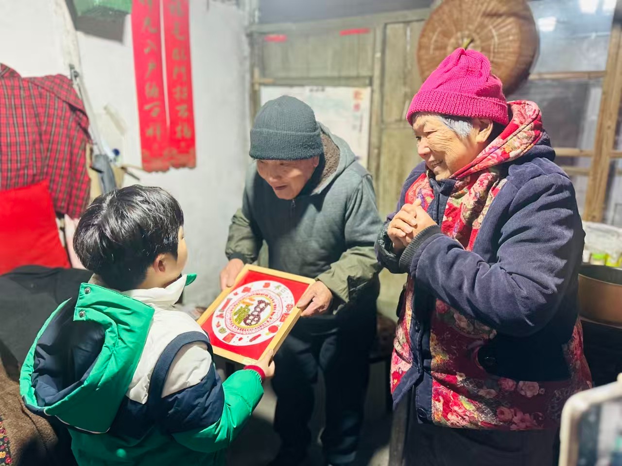 在网格员和幼儿园老师的陪同下,孩子们手捧着这份独一无二的食材福字画,来到辖区三户高龄老人家中。94岁的林爷爷看着墙上色彩斑斓的福字,轻轻触摸着颗粒分明的食材,脸上露出欣慰的笑容:“活了这么大岁数,第一次收到用腊八粥食材做的福字,又好看又暖心,谢谢孩子们,也谢谢社区的惦记!”