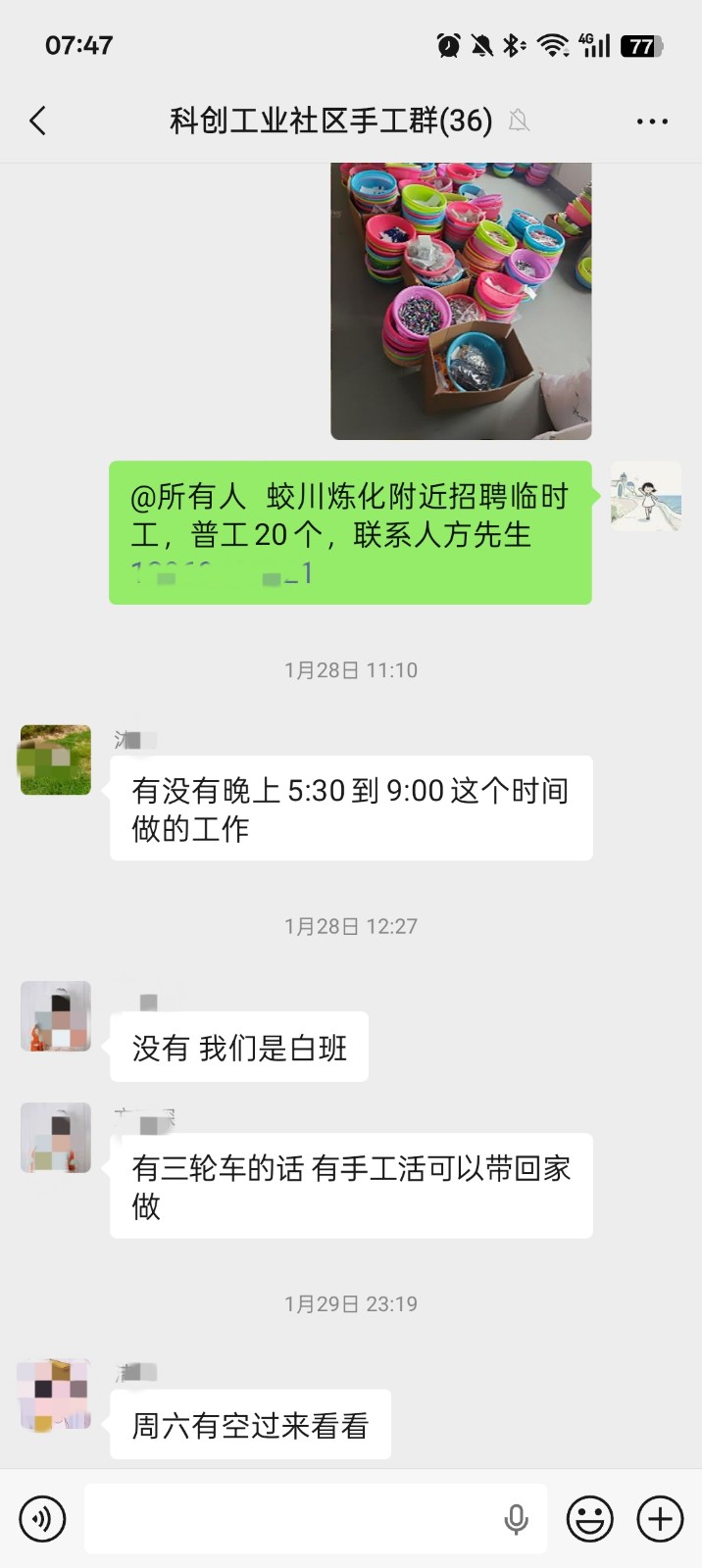党建是“红色引擎”,网格是“民情探头”。社区党组织牵头组建“网格就业专班”,网格员化身“就业红娘”,像筛金子般挖掘辖区企业零工资源,精准匹配宝妈、老漂族、失地农民等群体的就业需求。“我们聚焦‘时间碎片化、技能多样化’特点,把企业车间‘搬’到群众家门口,让闲置劳动力‘动’起来、腰包‘鼓’起来。”社区党委书记姚海伟介绍,前期已通过网格对接,为30余名群众找到灵活岗位。