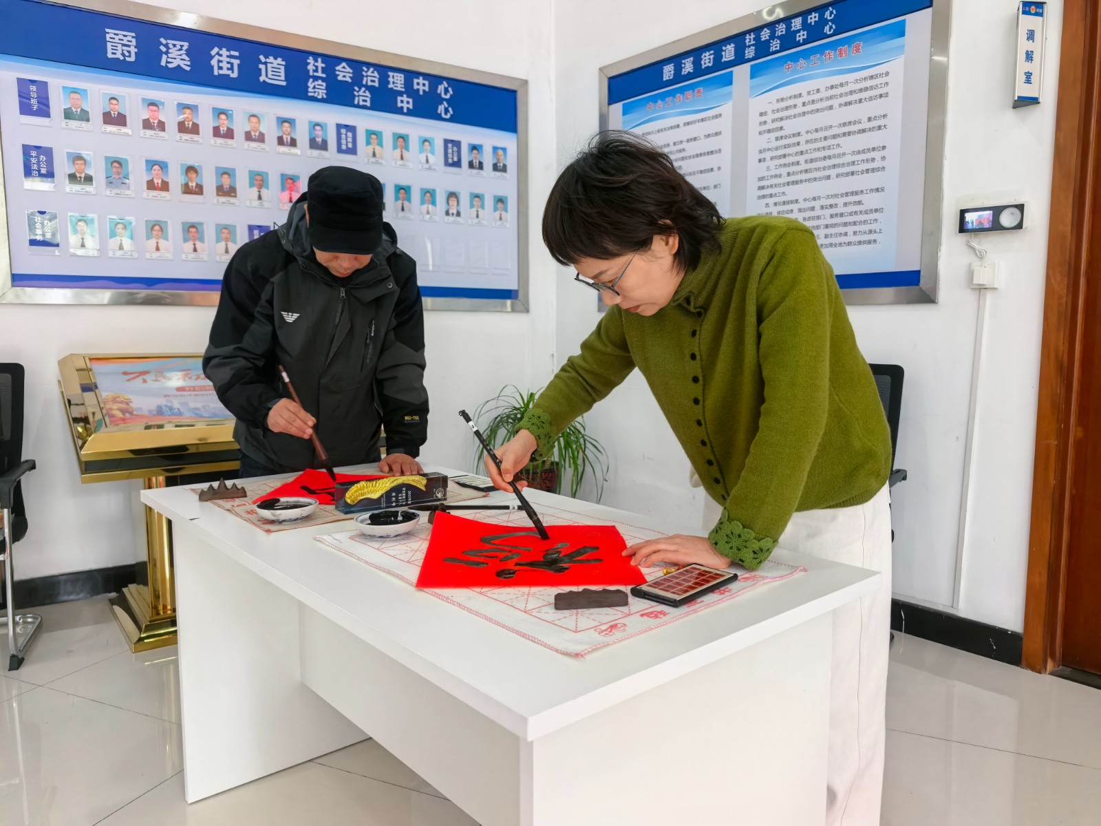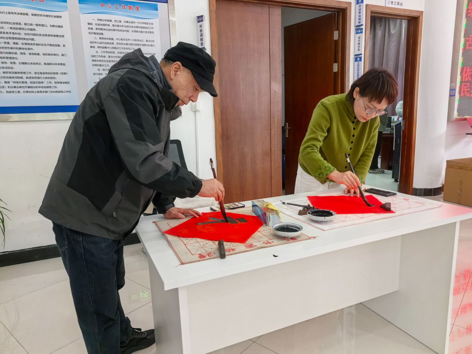 2026年2月4日上午8:30,爵溪街道综合治理中心内洋溢着浓浓的年味。由爵溪街道总工会主办,成人学校承办的“共话新春 共写春联”活动在这里热闹举行。活动吸引了辖区内的快递骑手、三轮车主、环卫工人、企业职工代表以及外来流动支部党员等近百人参与。