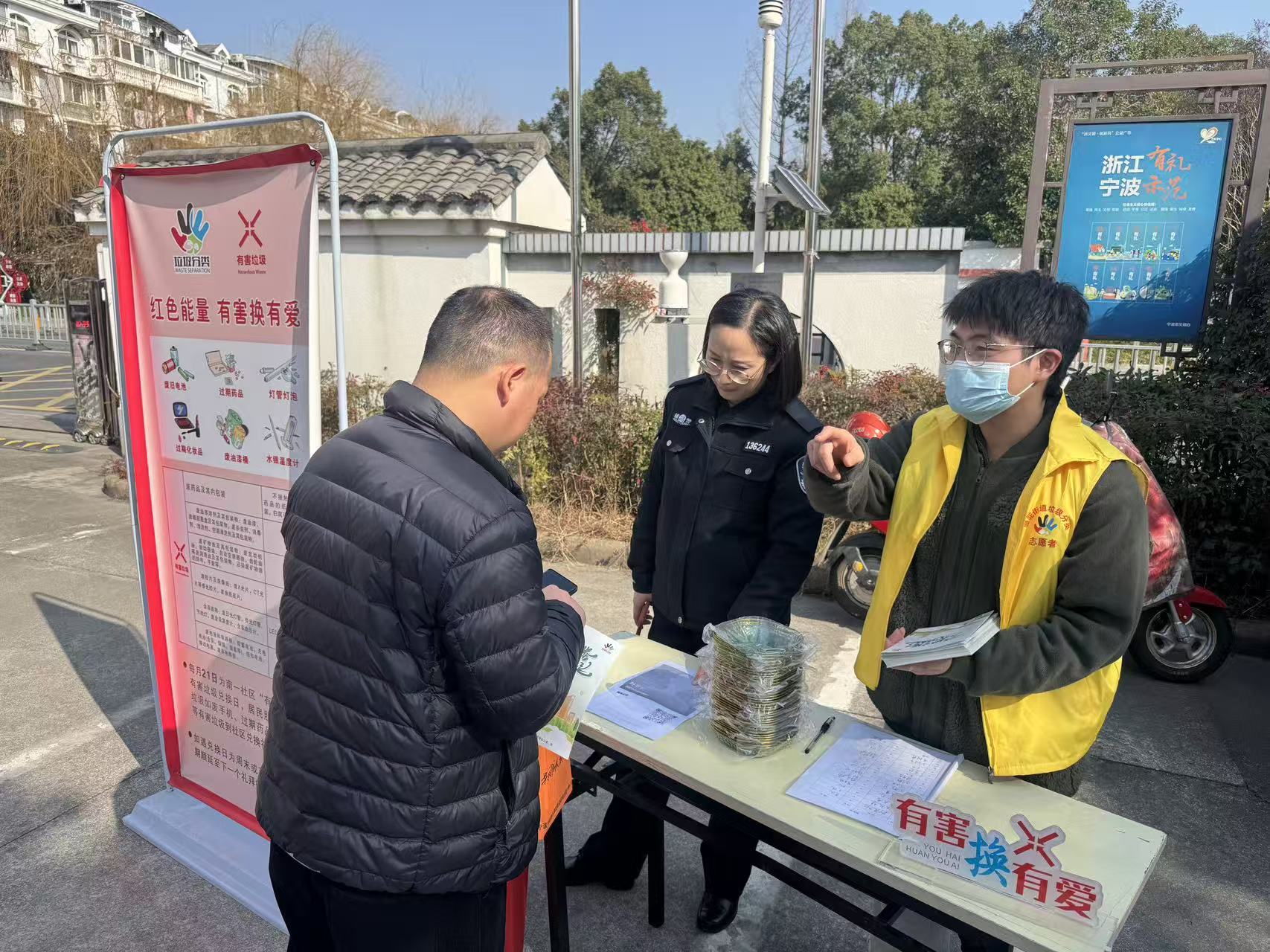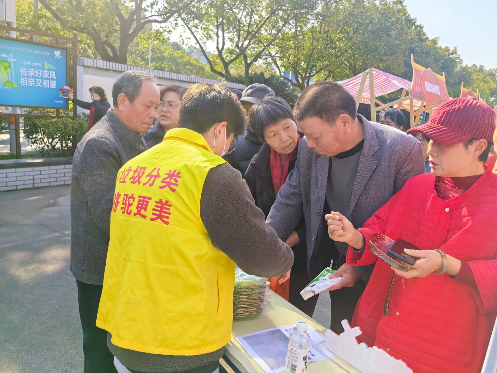 活动现场人头攒动、暖意融融。党员志愿者身着黄马甲,一边引导居民有序参与兑换,一边细致讲解垃圾分类知识:“过期药品、废旧电池属于有害垃圾,随意丢弃会污染土壤和水源,集中回收才能无害化处理”“旧手机、废灯管这些‘隐形污染者’,换购的同时还能兑换生活用品”。通俗易懂的讲解搭配实用的兑换福利,让居民们纷纷主动拿出家中积攒的各类有害垃圾,排队兑换心仪的“年货”,现场络绎不绝的人群成为集市上一道独特的“环保风景线”。