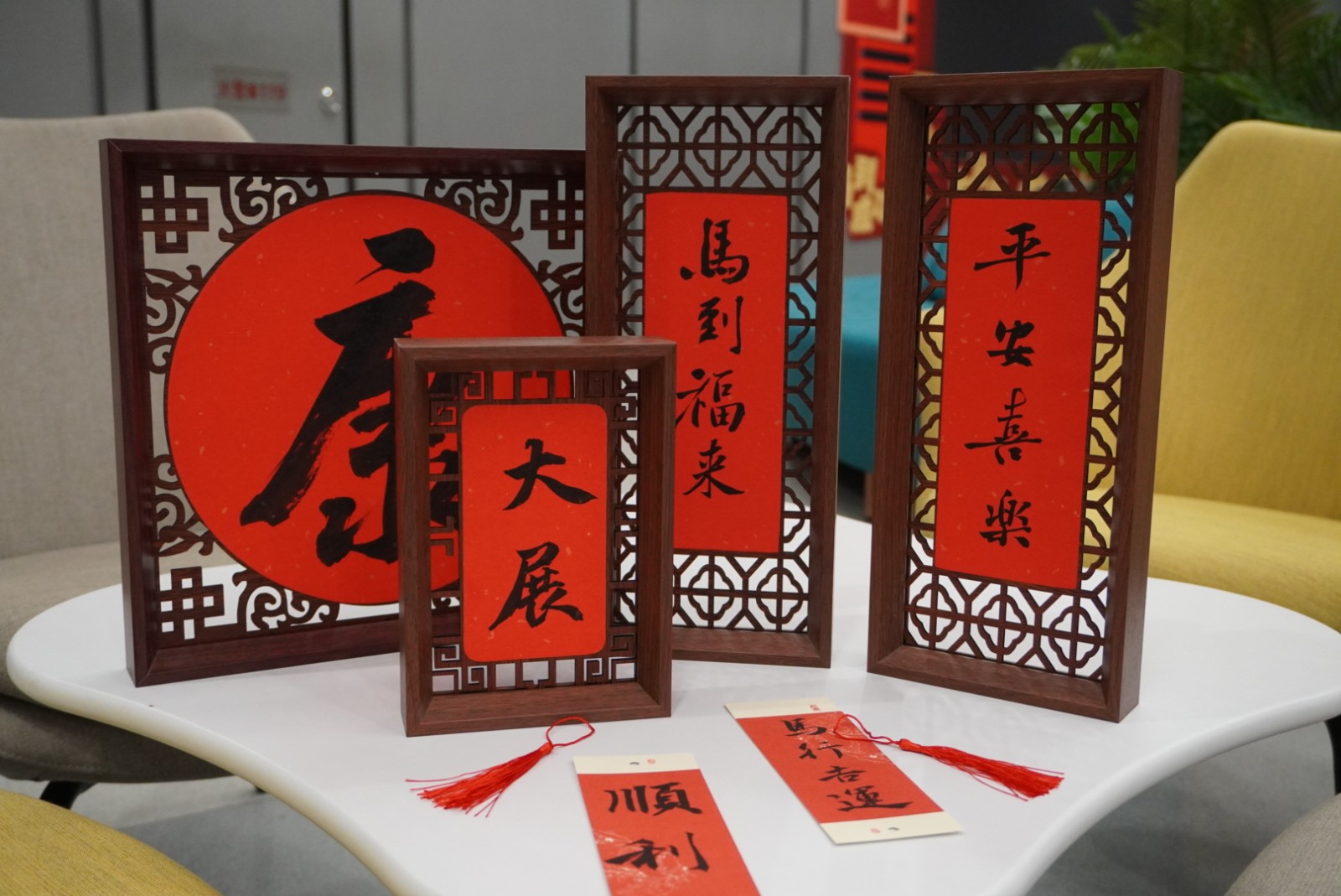 活动现场红纸铺展,翰墨飘香。书法老师们凝神聚气,笔走龙蛇,一副副寓意吉祥的春联、一个个饱满雄健的“福”字、一幅幅精美的摆台作品、一张张雅致的书签在他们手中诞生。春联内容既有传统佳句,也有结合科研特色的创新对联,既有对家国昌盛的美好祝愿,也有对科研创新的热情礼赞。