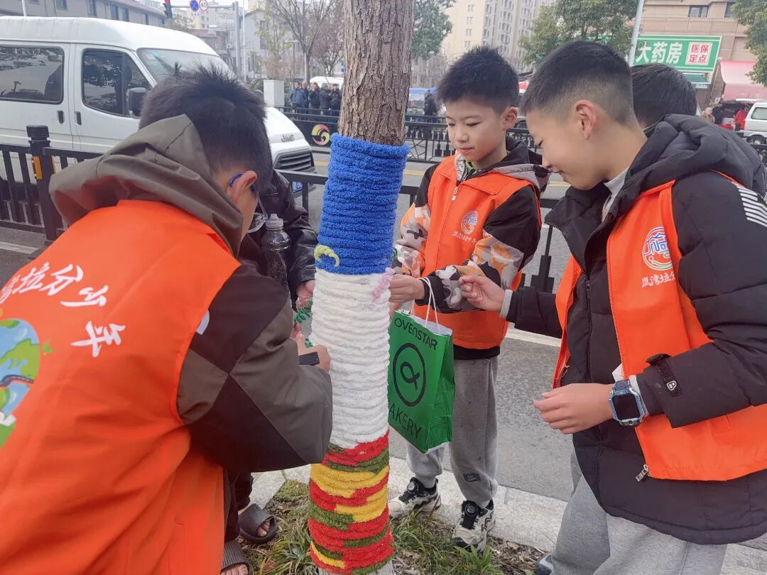 “小候鸟”们手持保温棉、装饰绳等材料,为辖区内的大树“装扮穿新衣”。孩子们踮起脚尖、相互配合,小心翼翼地为树干缠绕保温棉,细致地整理装饰绳,一边轻声说“大树也要暖暖过冬”,稚嫩的脸庞上满是认真与温柔。经过孩子们的精心装扮,一棵棵大树穿上了整齐的“冬衣”,不仅有效帮助树木抵御严寒、安全越冬,更为冬日的社区增添了一抹亮色与温情,让邻里在不经意间感受到社区的温暖与生机。
