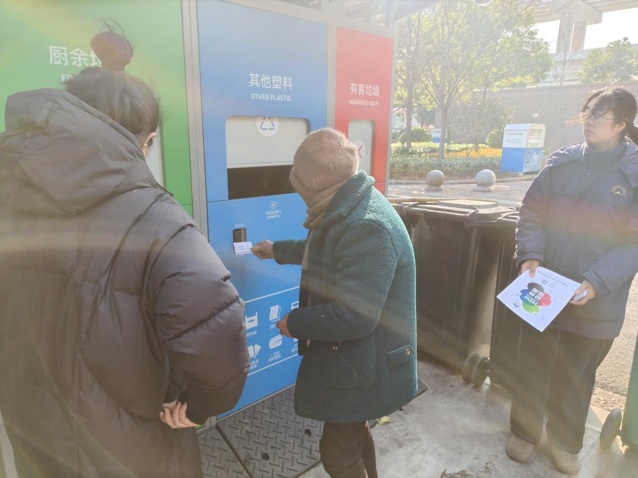 培训活动采取“室内理论+室外实操”相结合的方式。在“源·聚邻里街圈”党群服务中心的理论课堂上,社区志愿者首先为大家讲解了全品类垃圾分类的标准,结合居民日常让大家清晰掌握各类垃圾的归属类别。随后,志愿者通过PPT演示,详细介绍了智能垃圾分类柜的操作流程、积分规则以及常见问题的处理方法。 室外实操环节则设在九龙家苑四期的智能垃圾分类柜旁。在志愿者的指导下,物业人员和督导员率先进行模拟投放,熟悉刷卡、开箱、投放、关箱的完整流程。居民们也纷纷上前体验,一位阿姨在成功投放厨余垃圾后笑着说:“原来刷一下卡就能开门,还能攒积分换日用品,真是又方便又有意义!”针对部分居民提出的“塑料容器如何投放”“积分怎么查询”等问题,志愿者都一一耐心解答。