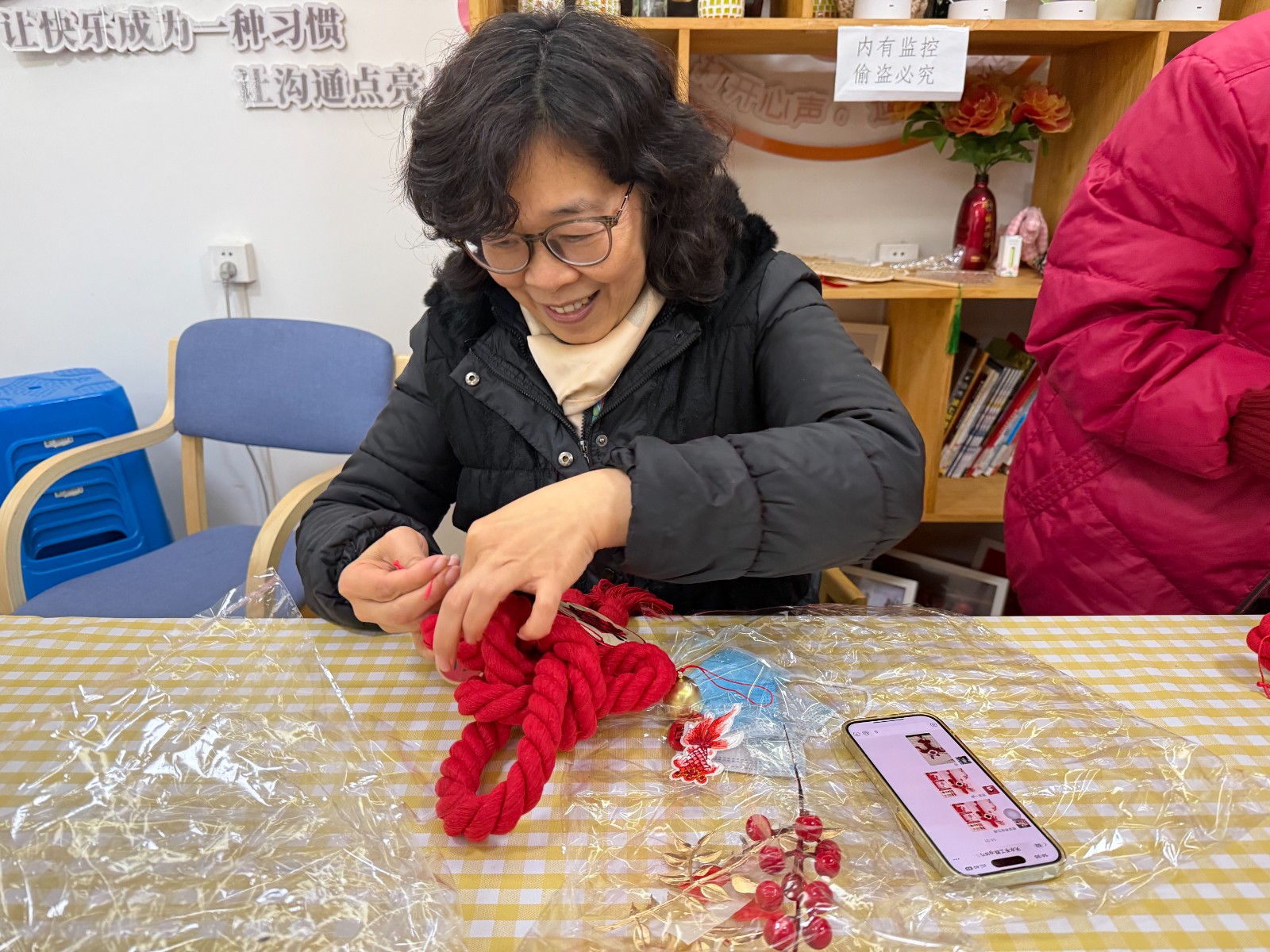 居民们围坐在一起,穿绳、打结、整形、搭配流苏,一边交流心得,一边精心创作。老少携手、邻里互助,原本普通的红绳在指尖翻飞间,化作一个个饱满规整、寓意美好的万字结。大家纷纷将成品悬挂展示,拍照留念,脸上洋溢着收获的喜悦。不少居民表示,亲手制作的万字结更有温度,既是新春装饰,也是对家人的美好祝福。
