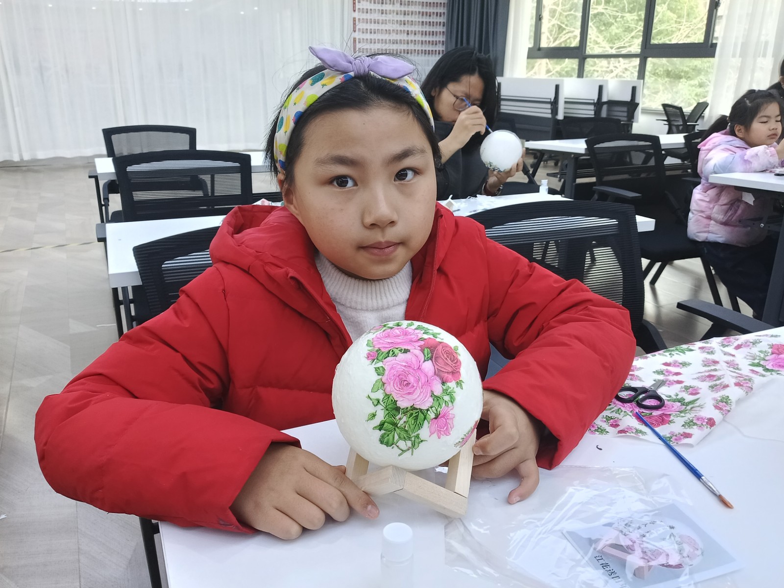 随后,手工DIY 制作环节正式开始,工作人员为每位青少年发放了材料包,包括3D月球立体台灯,木架、蝶骨巴特图案纸章,古诗词纸条,剪刀,胶水和胶水刷笔。大家在志愿者老师的指导下,在家长的帮助下,剪贴、拼搭。他们根据自己的审美和喜好,通过巧妙的构思和布局,将剪下来的蝶骨巴特图案粘贴在球灯上。