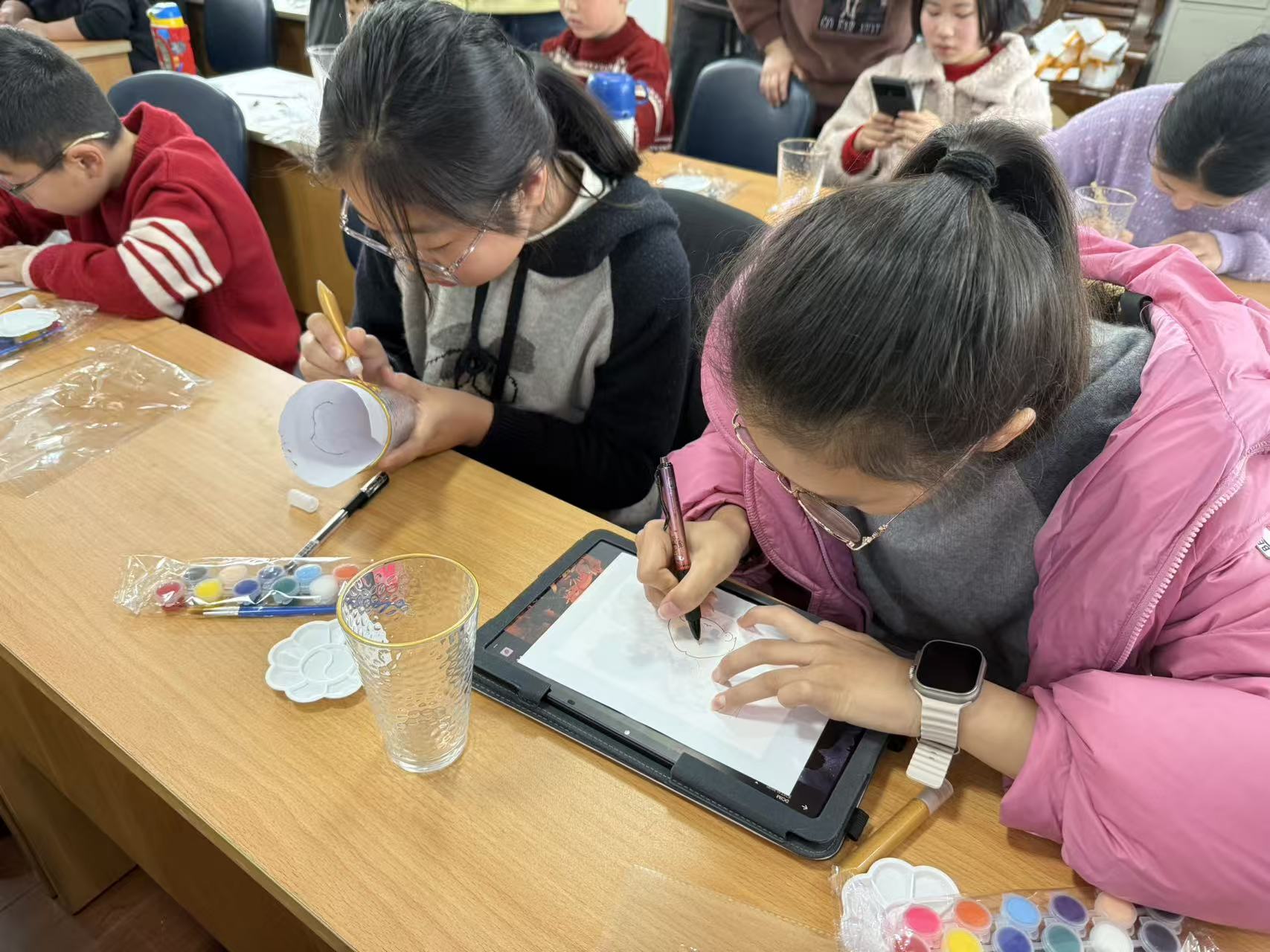 活动伊始,社区工作人员为孩子们分发了透明的玻璃杯和五彩斑斓的绘画颜料。在志愿者的指导下,小朋友们迫不及待地拿起画笔,在玻璃杯上勾勒线条、填充颜色。有的孩子画上了灿烂的太阳和飞翔的小鸟,有的描绘了美丽的花朵和温馨的家园,还有的发挥想象力,将心中的童话世界呈现在杯身上。每一笔、每一画,都饱含着孩子们纯真的情感和对美好生活的向往。