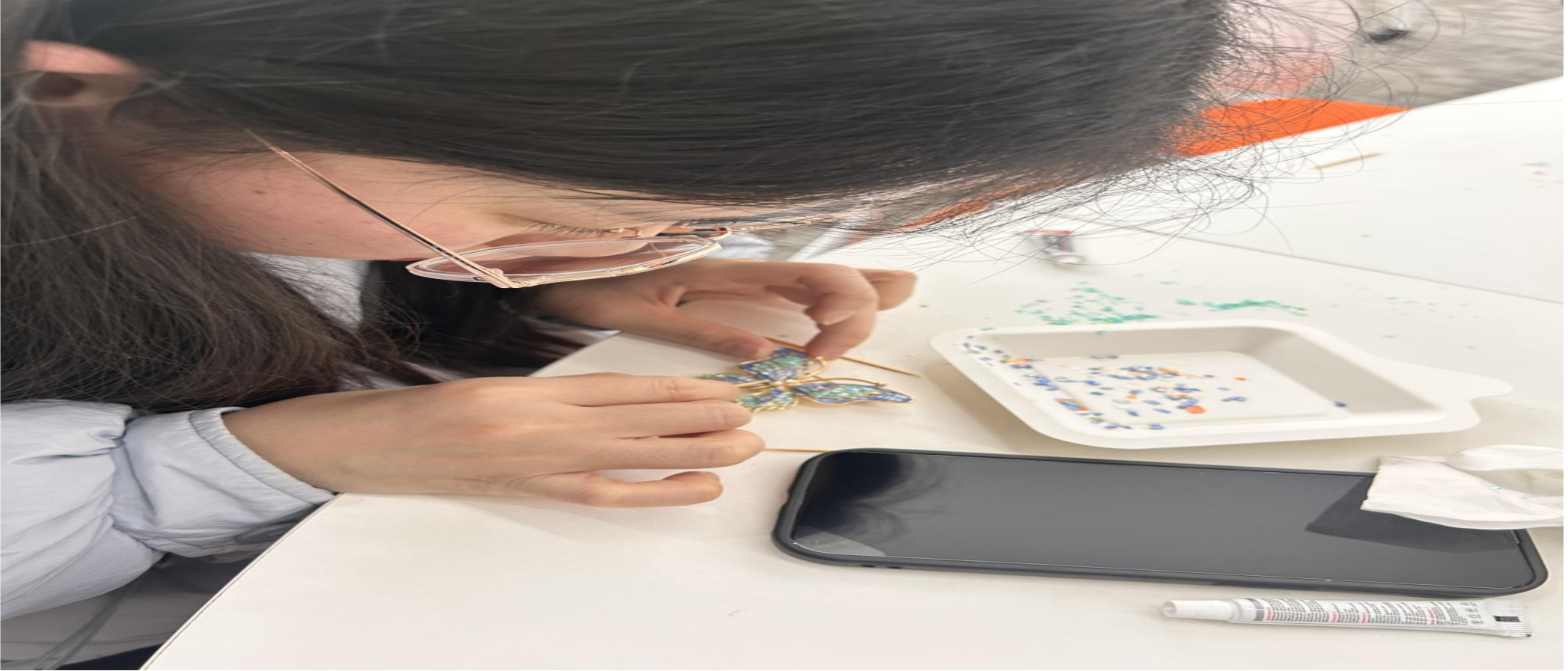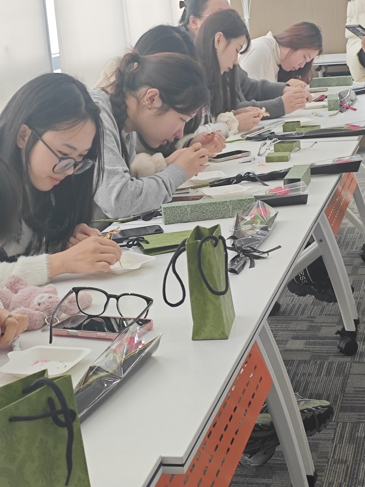 科普与示范环节结束后,沉浸式手作创作正式拉开帷幕,这也是整场活动最受期待的核心环节。参与者们纷纷从琳琅满目的贝壳原料中挑选心仪的贝片,有人偏爱灵动雅致的花鸟纹样,有人钟情简约大气的几何线条,还有不少人大胆尝试个性拼色设计,想要打造独一无二的专属作品。导师与助理们分区域在现场巡回指导,遇到毫无基础的新手,便耐心引导他们参考模板描线定位;面对有自己创作想法的进阶者,则鼓励他们大胆突破,尝试独特的拼镶手法。创作过程中,现场不时响起 匠心小 tips” 播报,贴心分享螺钿片保存、亮油涂抹均匀等实用技巧,帮助大家巧妙规避创作误区,每个人都沉浸在专注的创作中,指尖流转间感受着非遗工艺的独特魅力。