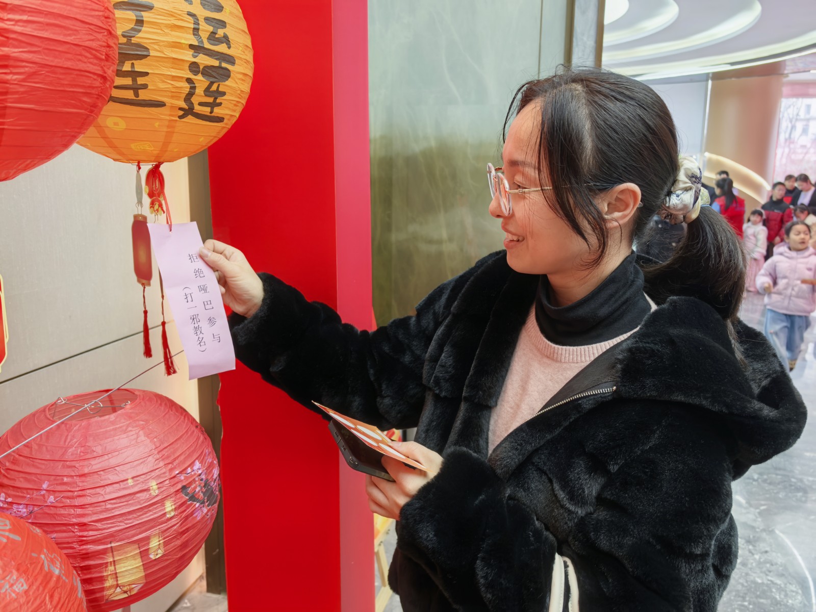 活动现场,社区工作人员通过发放宣传单、设置反诈灯谜区等方式,向前来参加活动的居民普及常见的诈骗手段。“足不出户日进斗金——打一诈骗类型(刷单返利)”;“冒充公检法来电——打一心理状态(恐慌)”等等妙趣横生的谜面,让居民在欢声笑语中识破骗局。猜灯谜、赢平安,让防骗意识像汤圆一样“实心实意”。